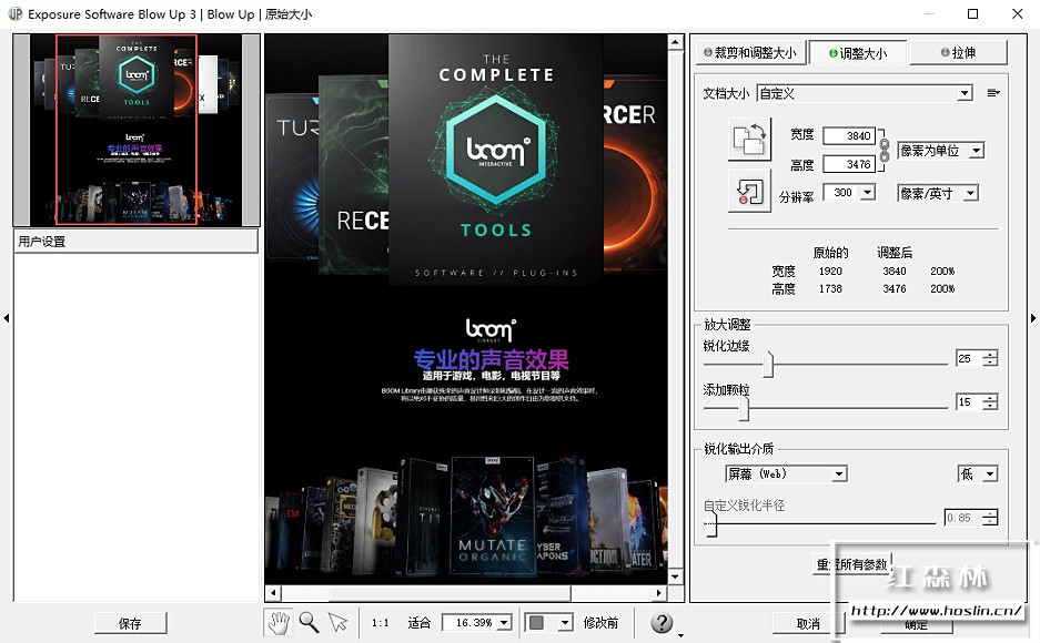 - 巨大影像:你可以调整大小高达300000像素每一边,最大的PS图象处理软件可以处理。当然,Photoshop会对这么大的正方形图像哽咽,但是如果你正在制作一个Photoshop可以处理的广告牌,那么Alien Skin Blow Up 3!