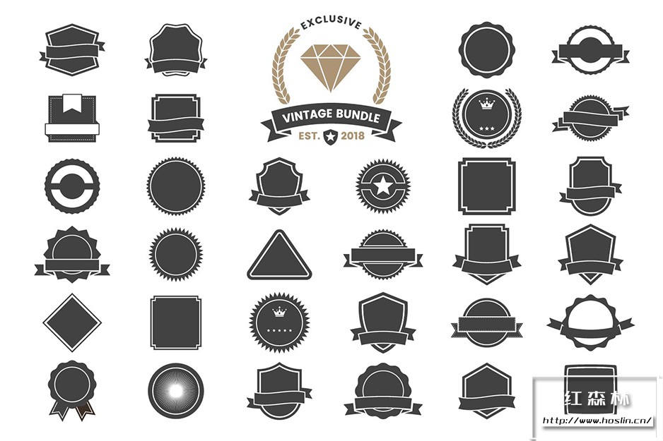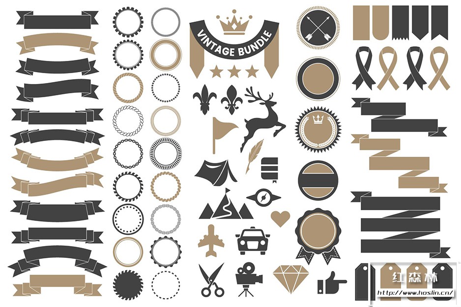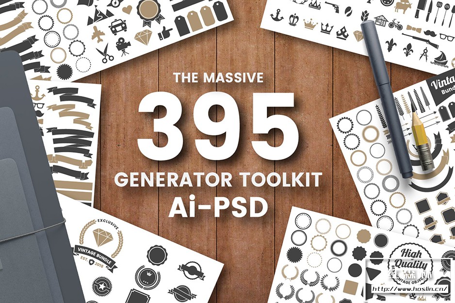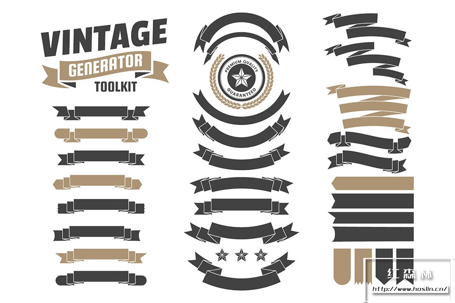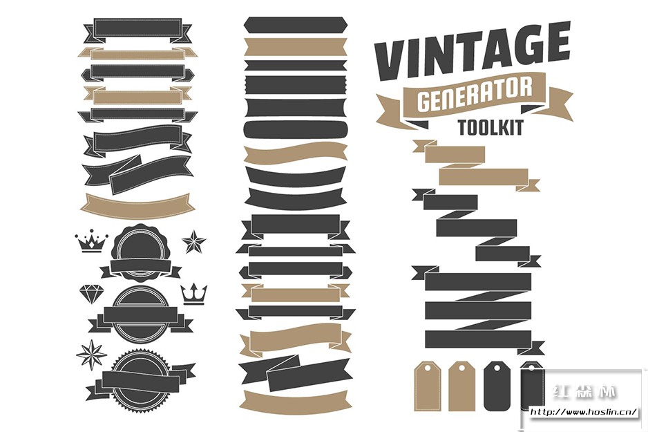 关于产品:395 Vintage Generator Toolkit,这是我的 VINTAGE BADGE 和 RIBBON 元素的集合,包括了很多复古风格的徽章标志和绶带元素,包含多种不同的风格。
