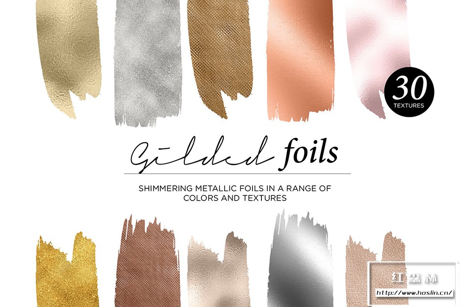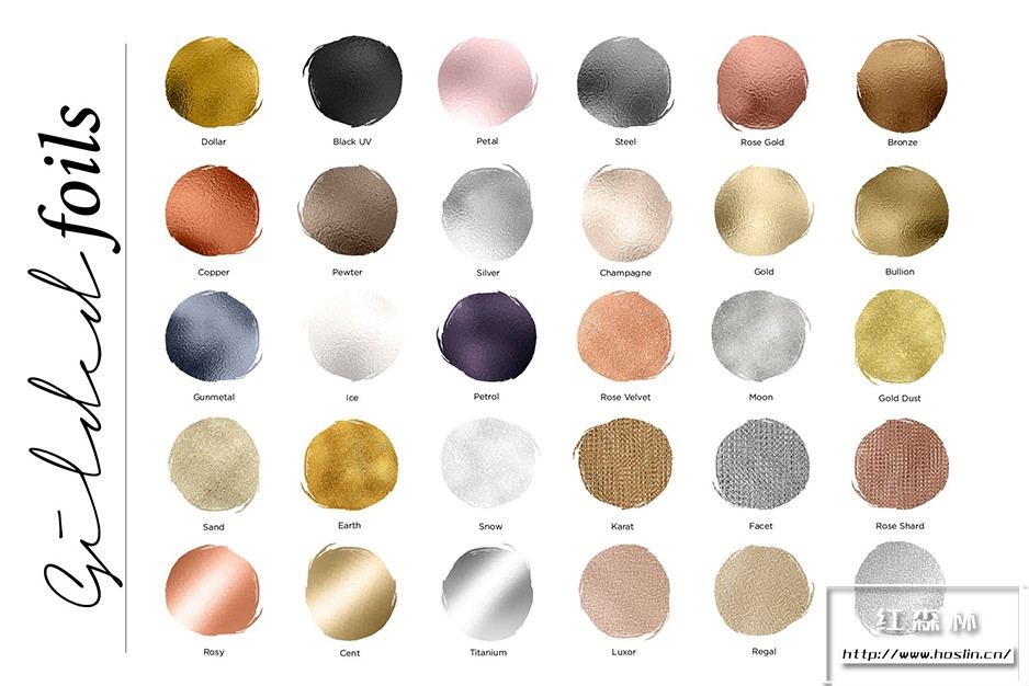 - 30 种镀金箔纹理:具有 各种流行的颜色和闪烁的纹理