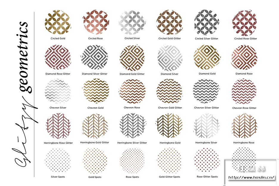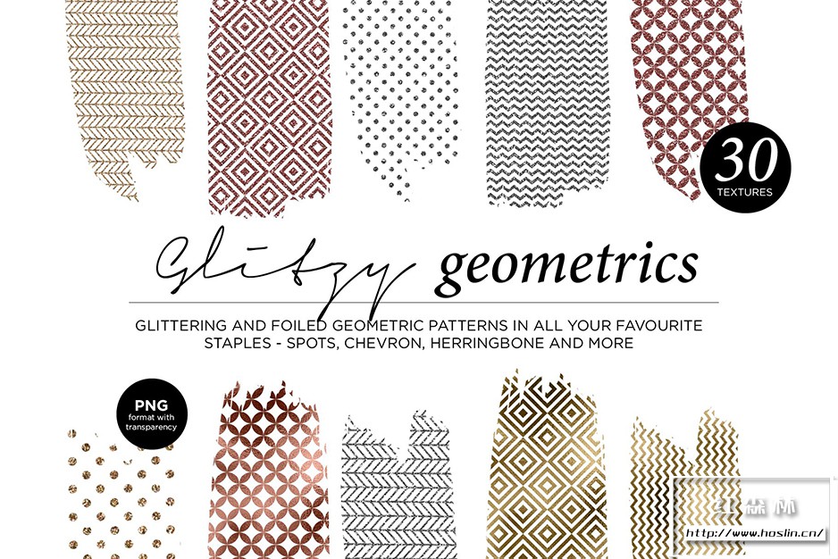 - 30 种闪亮的几何图案:几何图案通过闪光和箔饰面变得奢华,保存为 PNG 文件,准备叠加在您选择的背景颜色上