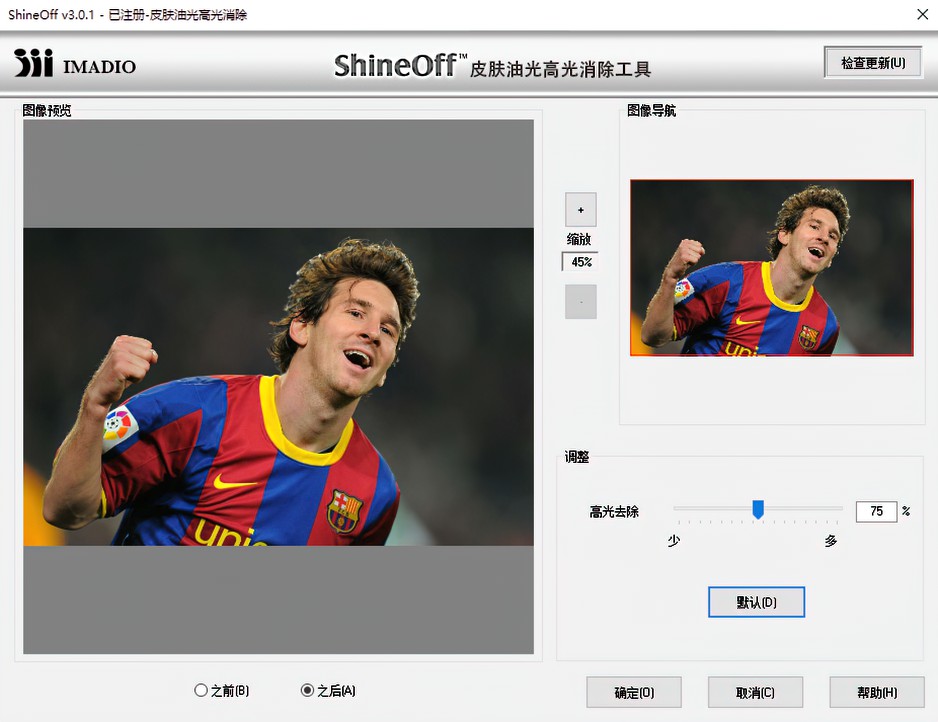 Imadio ShineOff 用户界面现在有一个滑块来控制要去除的光泽量。默认值为 75%。将滑块向左移动会留下更多光泽。向右移动滑块可消除更多光泽。