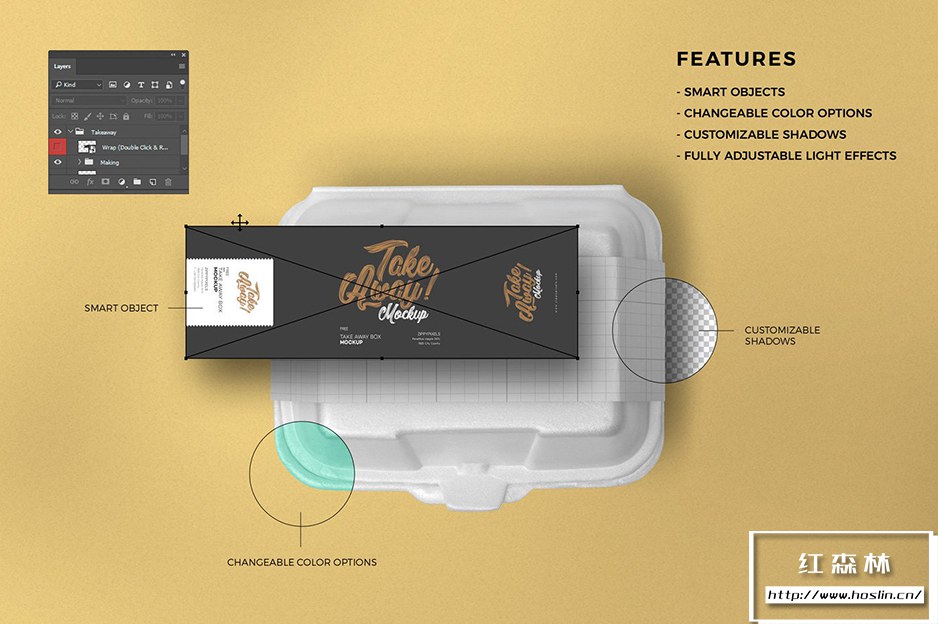 • 5 个食品盒品牌模型:这些食品盒模型将帮助您用饮料罐和沙拉外卖盒展示您的品牌设计。您可以调整盒子、叉子和盒子透明盖子的颜色。此外,您还可以自定义模型的效果、阴影和木质背景。
