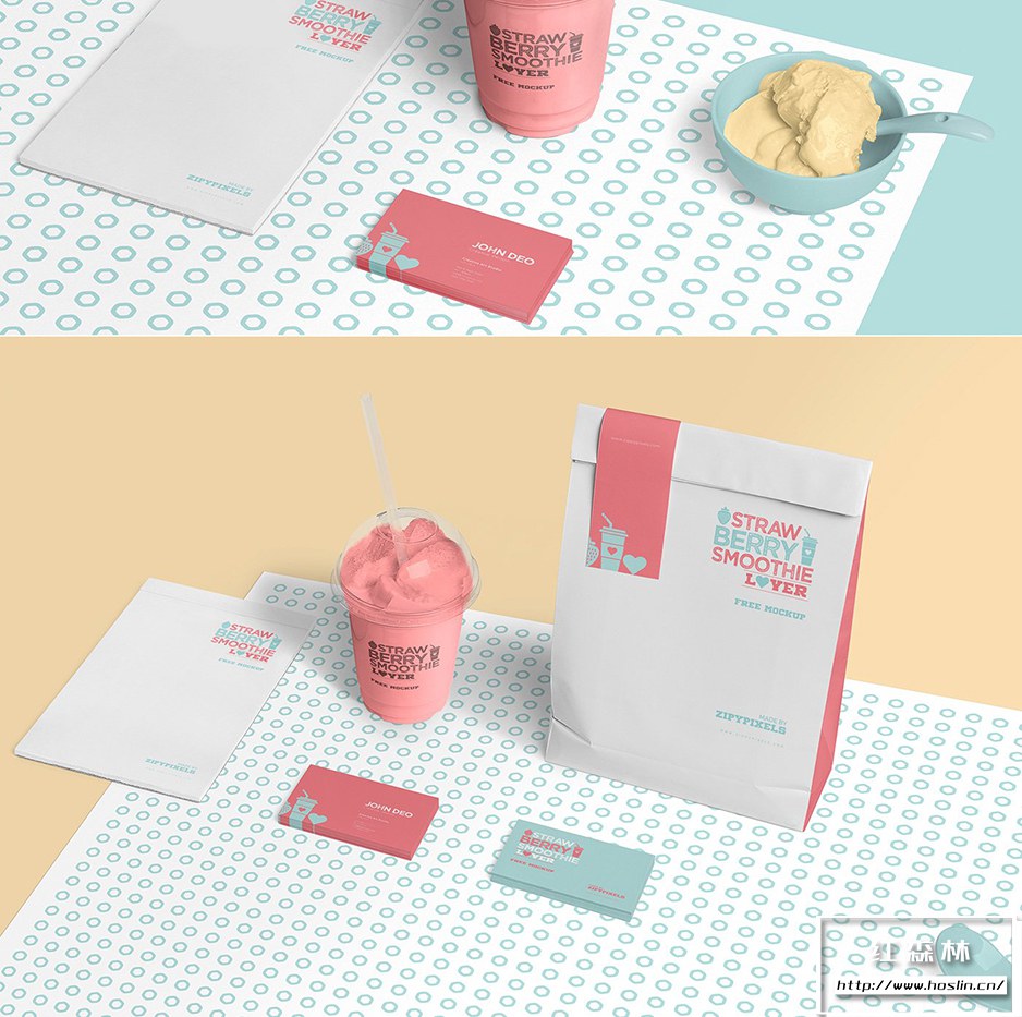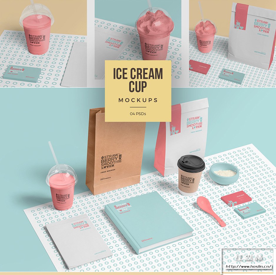 • 4 个透明冰淇淋杯样机:展示一个完全可定制的样机包,其中包含 4 个独特排列的样机场景,以展示您的包装和品牌设计。这个模型包提供透明塑料杯、购物袋、咖啡杯、名片、记事本和精装书来展示您的设计,此外它还包含一些其他物品,包括勺子、冰淇淋碗和糖碗。