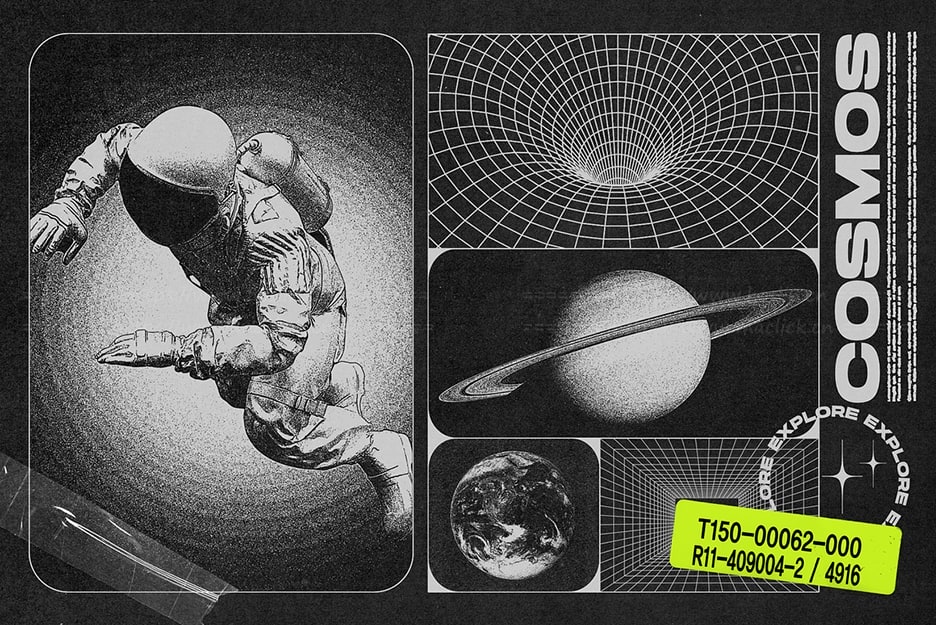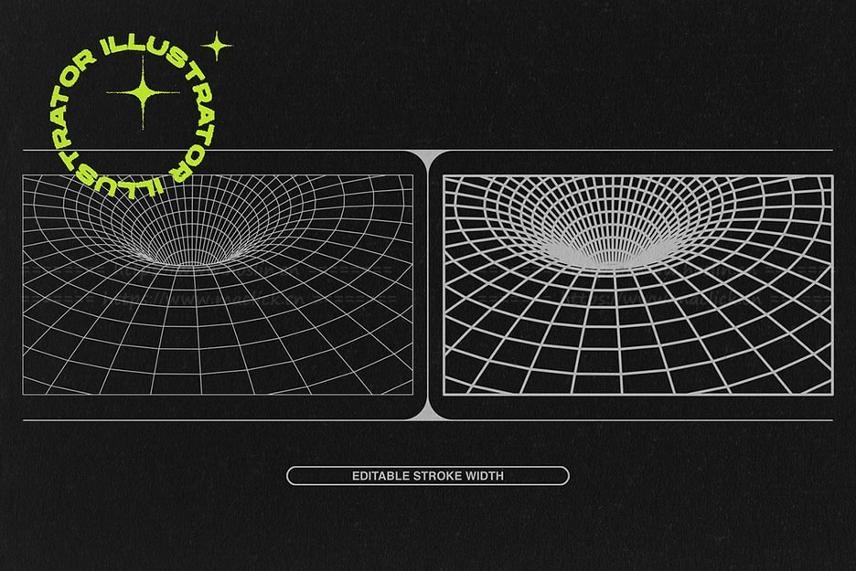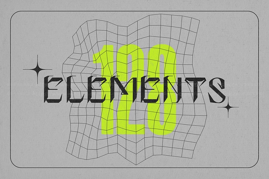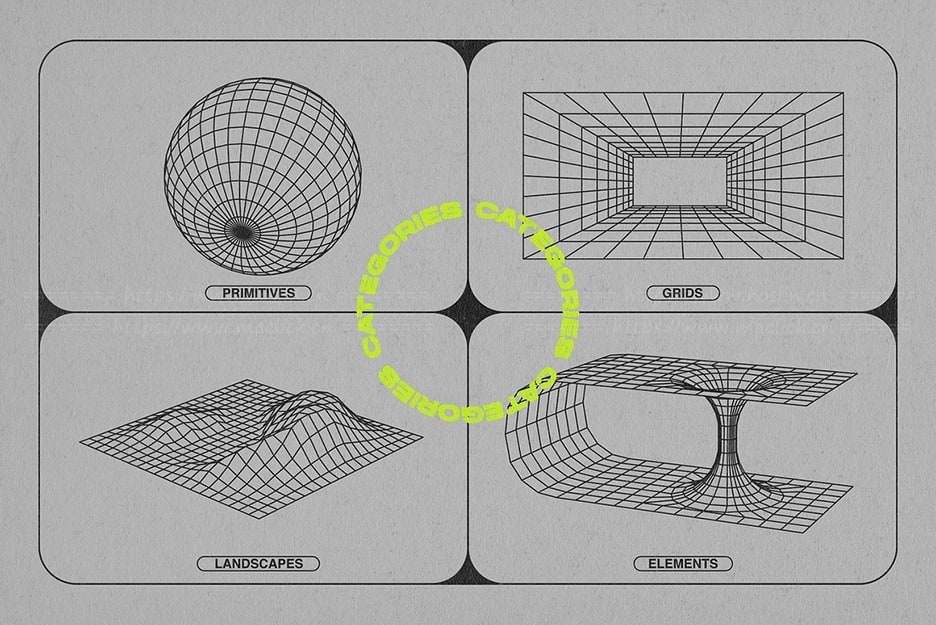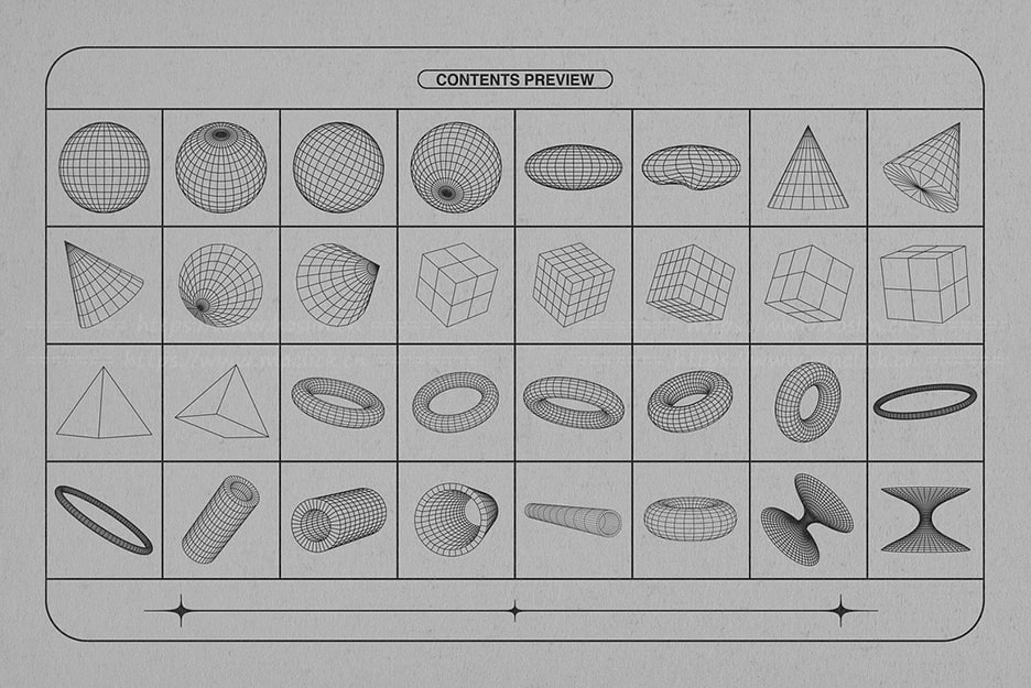 关于产品:该套件包括 128 种线框形状的集合,包括网格、几何形状和抽象元素等各种类别。它们可以结合起来创造独特的作品,也可以作为装饰添加到您的设计中,营造出复古的未来主义氛围。使用示例:海报、专辑封面、贴纸、标志元素。