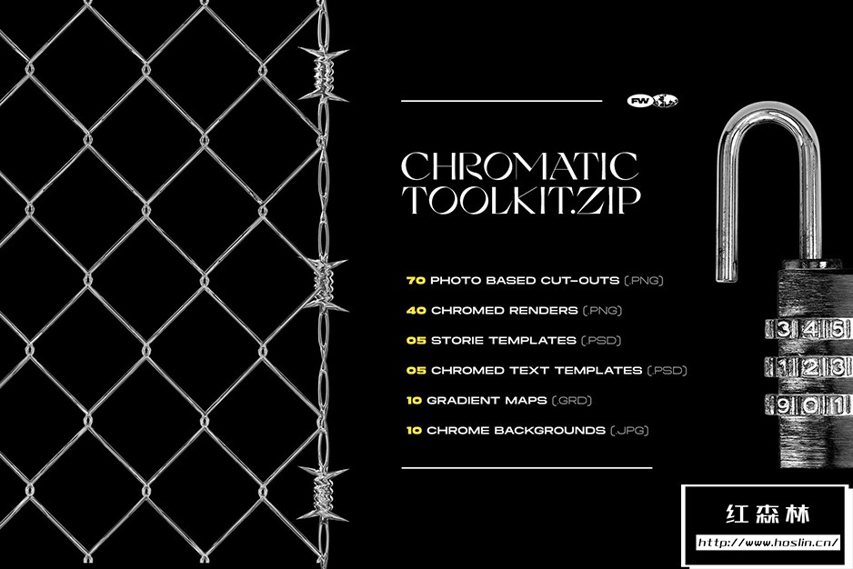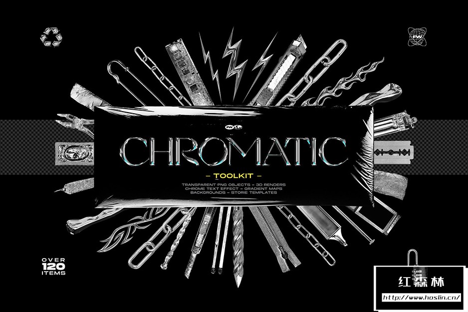 • 40 个 Chrome 3D 渲染,能够轻松导入并用于各种艺术设计。