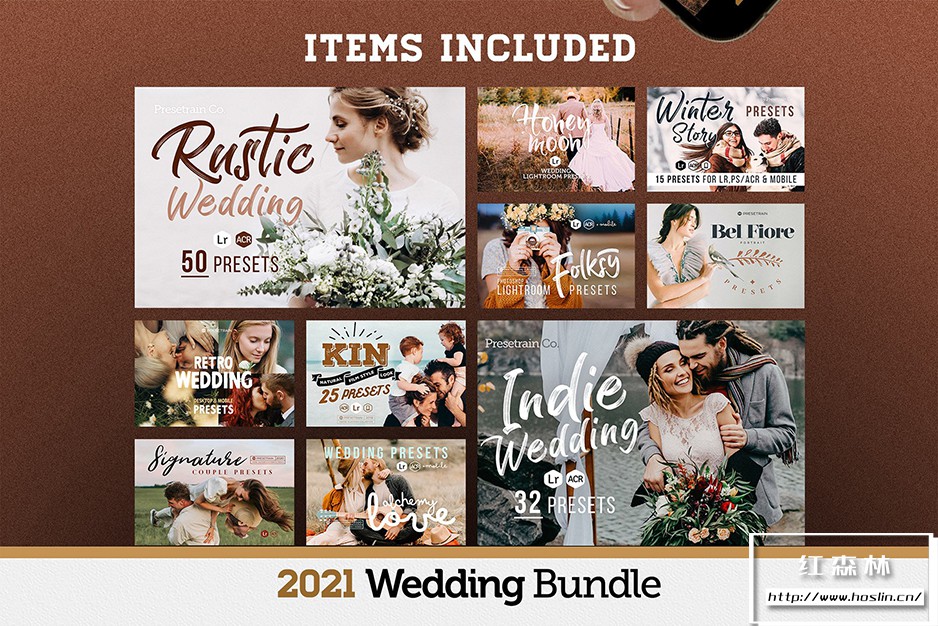 关于产品:200 多种婚礼预设套装包含 Presetrain 在 2019、2020 和 2021 年发布的最畅销婚礼预设系列。您的创意婚礼工作流程所需的一切。