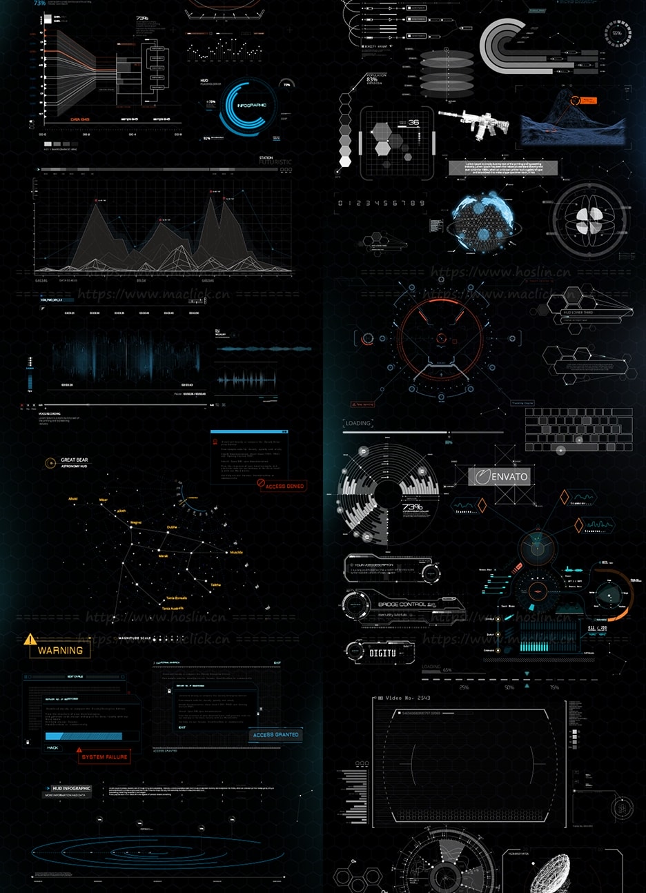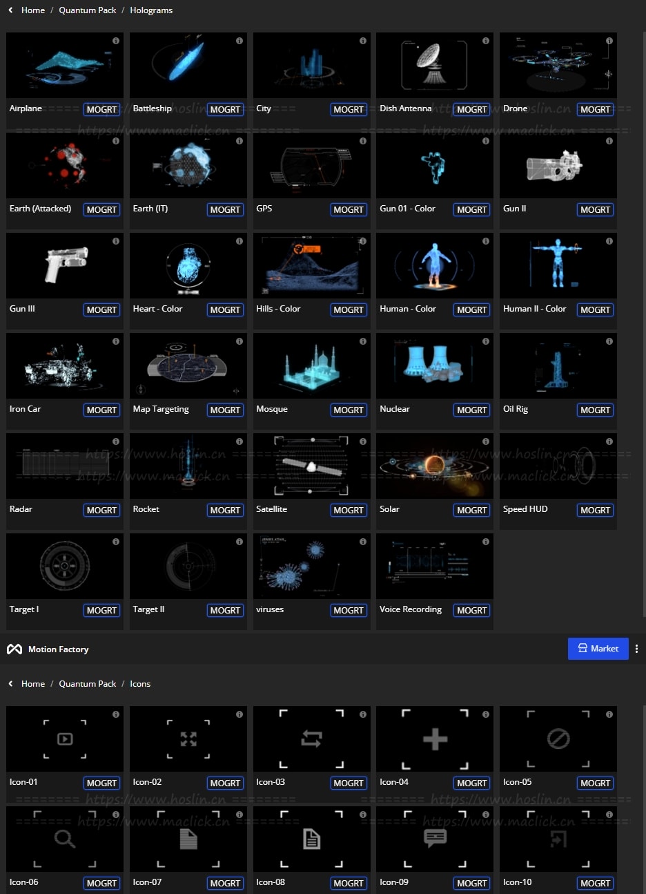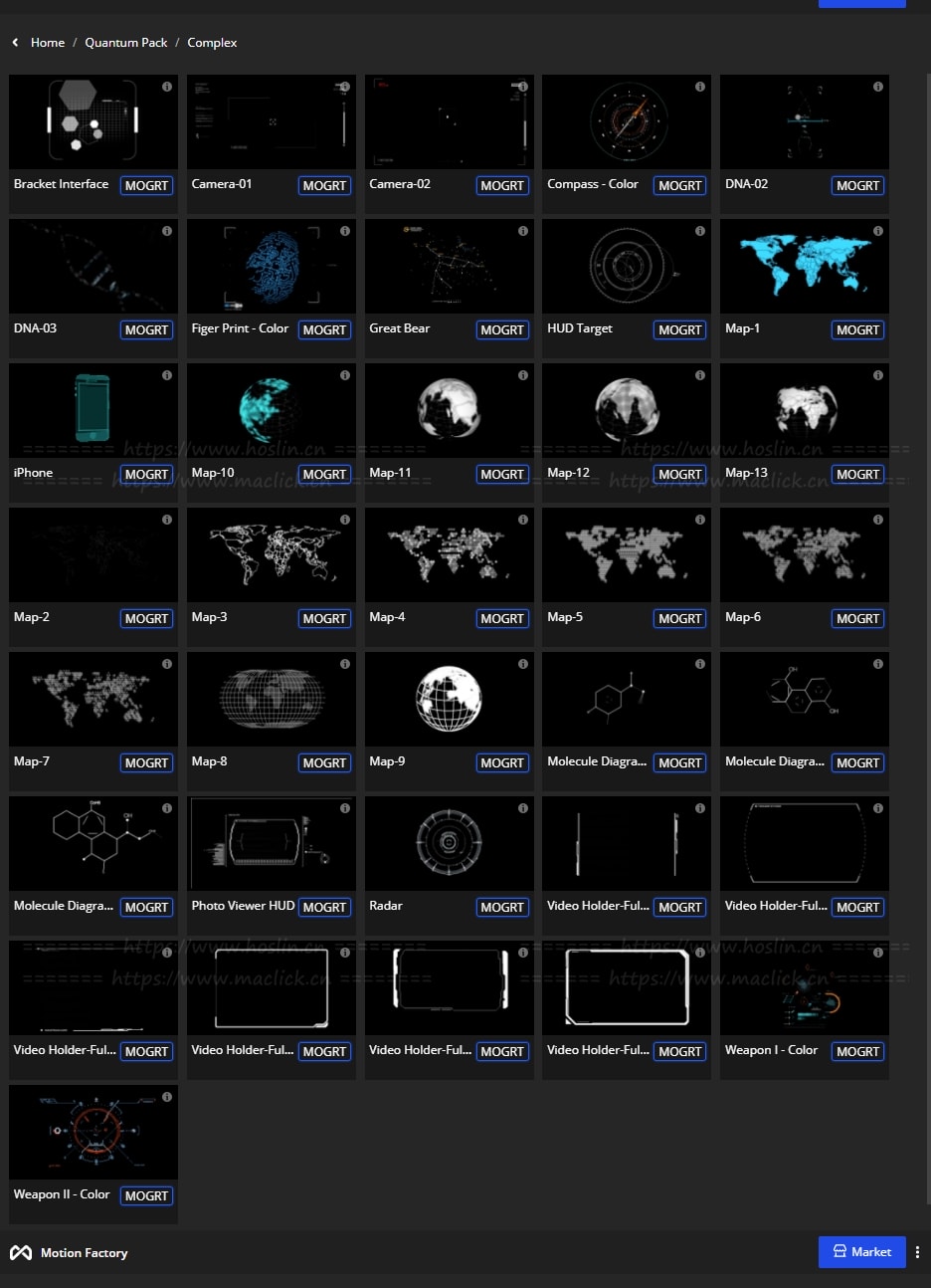 脚本提供了约375个高科技HUD元素和图形,可用于HUD视频、转场过渡、介绍、游戏和所有其他项目创建科幻HUD元素和未来派图形场景。通过Motion Factory脚本调用预设,可视化操作,能够调整大小位置颜色等属性。