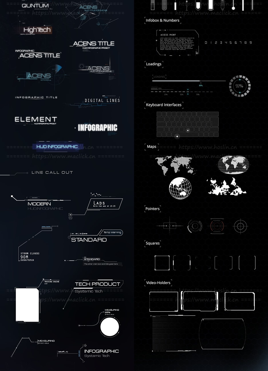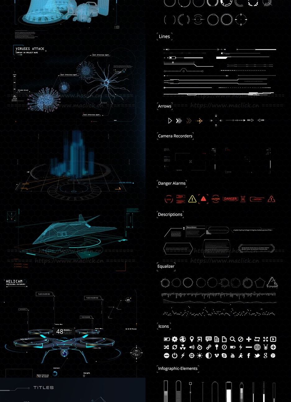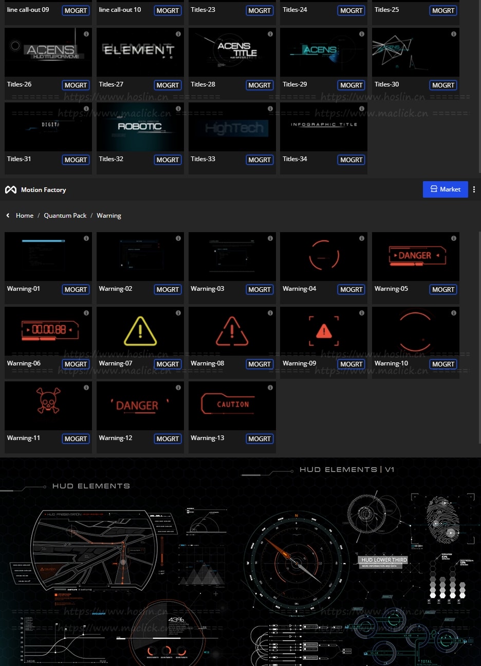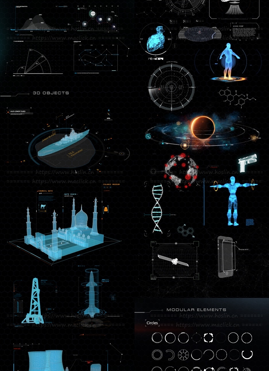 脚本提供了约375个高科技HUD元素和图形,可用于HUD视频、转场过渡、介绍、游戏和所有其他项目创建科幻HUD元素和未来派图形场景。通过Motion Factory脚本调用预设,可视化操作,能够调整大小位置颜色等属性。