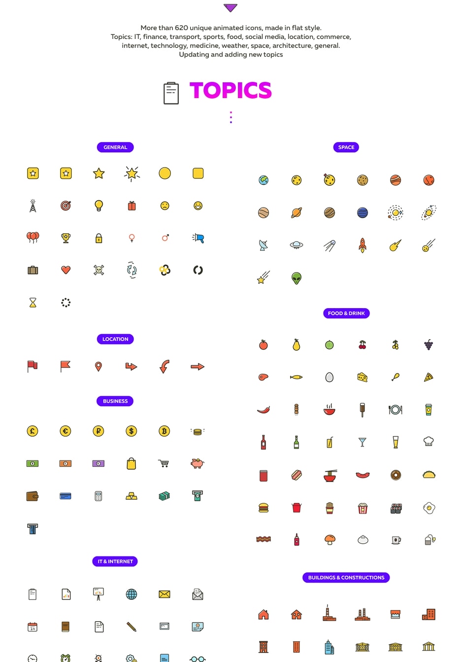 此图标包包含 620 多个动画图标。它分为不同的主题:商业、IT、互联网、运输、医学、天气、社会、空间、食品、运动、建筑、植物、地点等。还有其他主题:体育、娱乐、商业、教育、演讲、促销、广告、时尚、人与健康。图标易于使用,只需将任何演示文稿、促销、介绍、幻灯片、开场白粘贴到您的项目中。