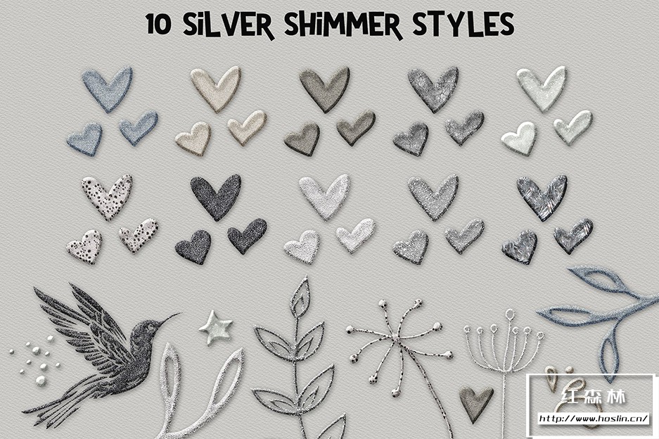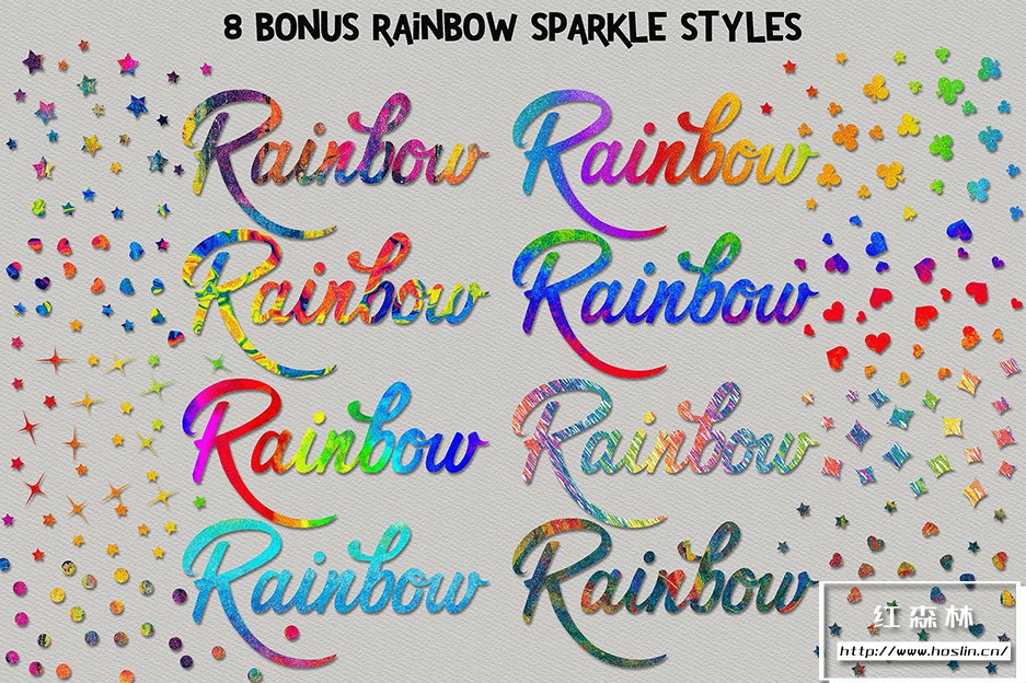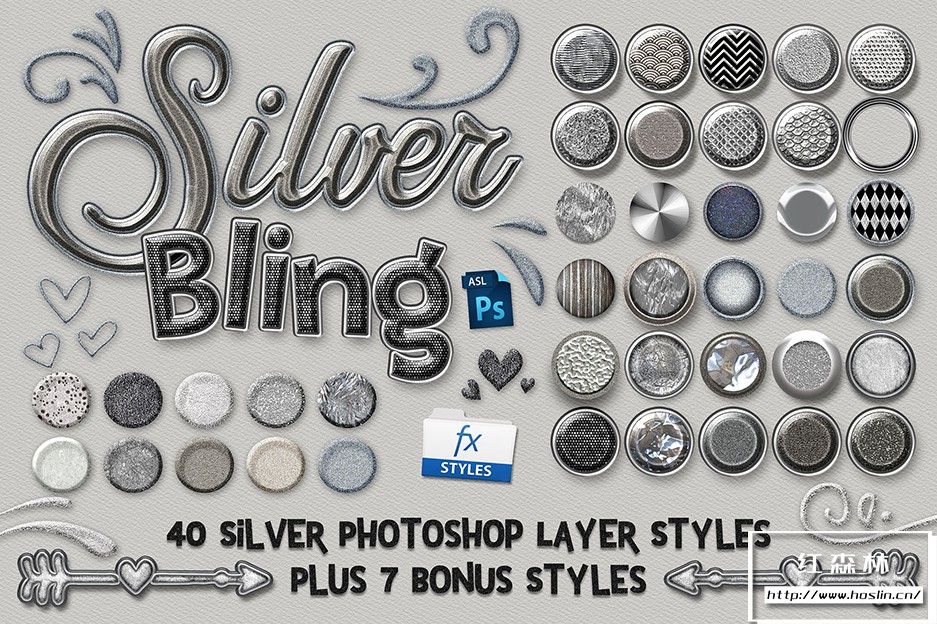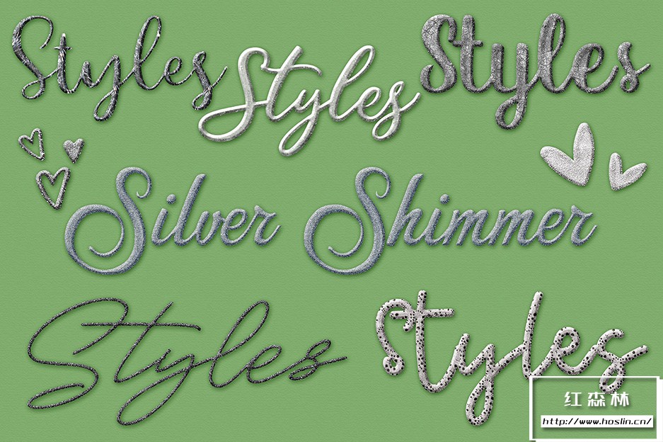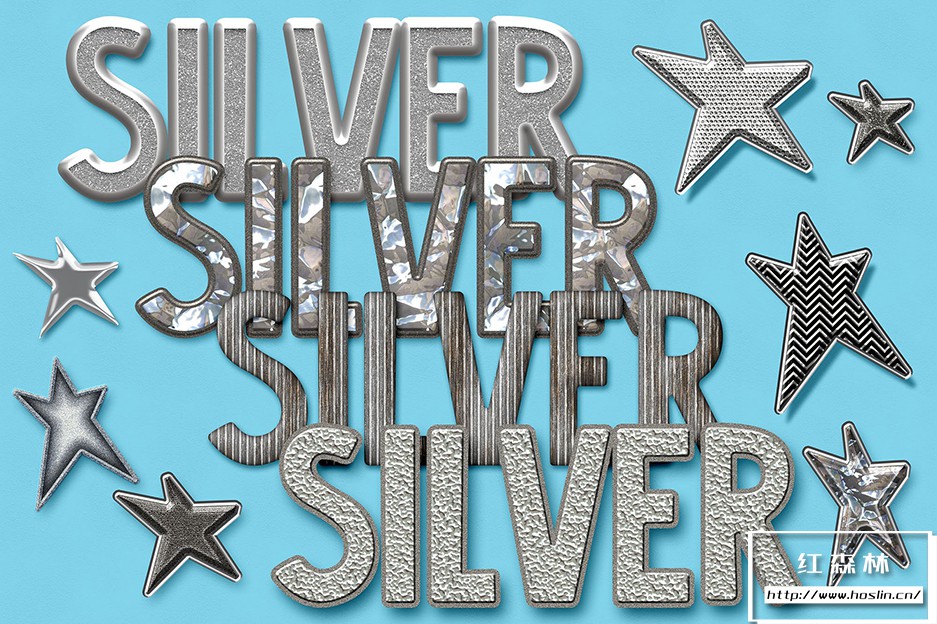在这组中有 30 种 Silver Bling 图层样式、10 种 Silver Shimmer 图层样式和 7 种额外的 Rainbow Sparkle 图层样式。