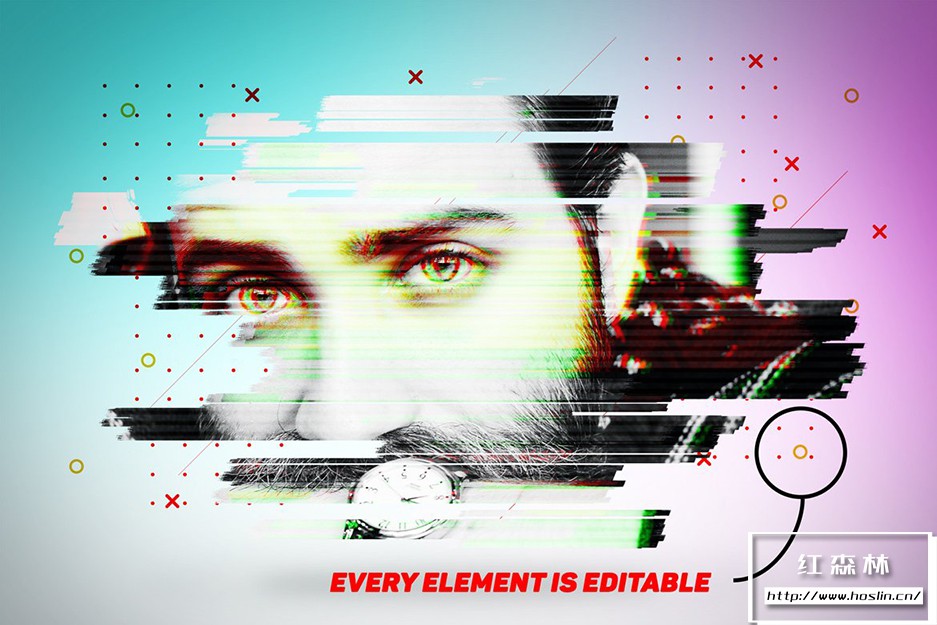 包括 3 种不同的故障效果。您可以选择哪一个适合您的需要,或者如果您喜欢在 Photoshop 中工作,您可以编辑设计的每个部分 – 所有图层都是可编辑的并且描述得很好。