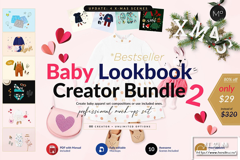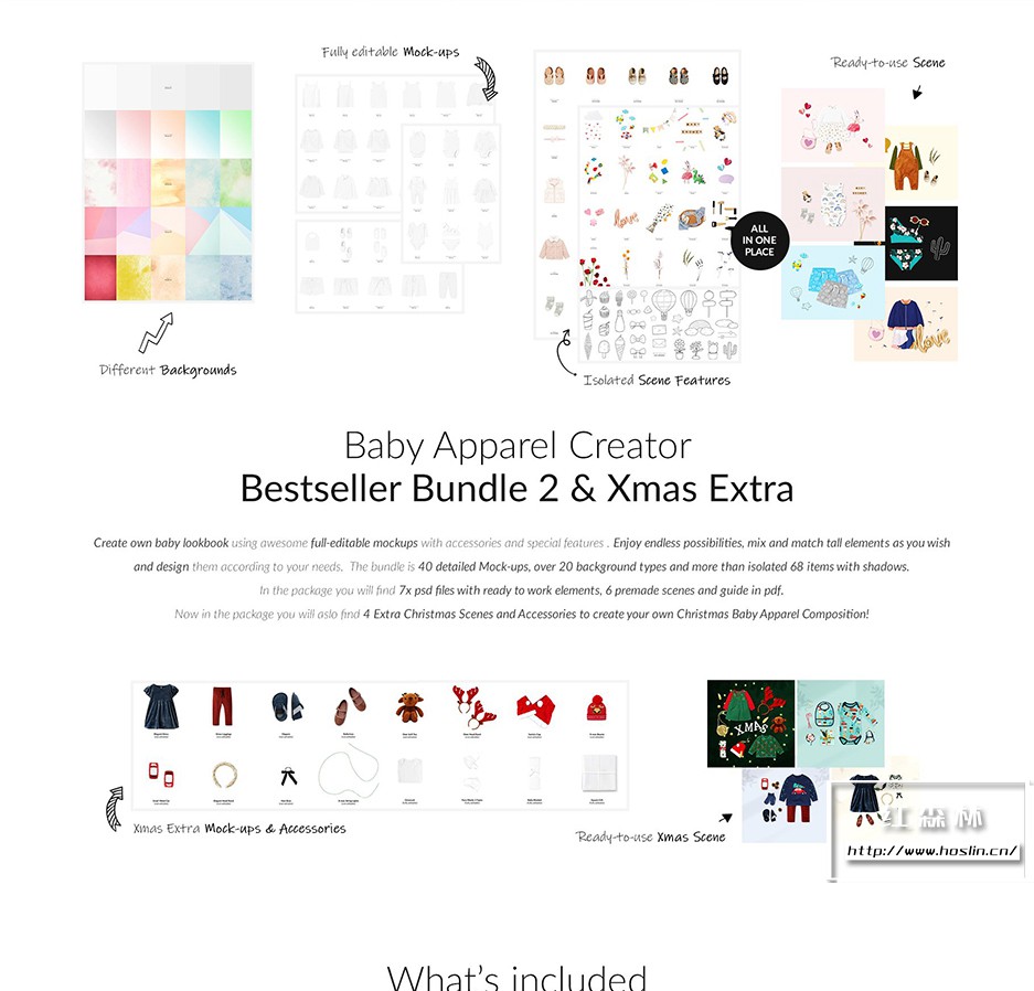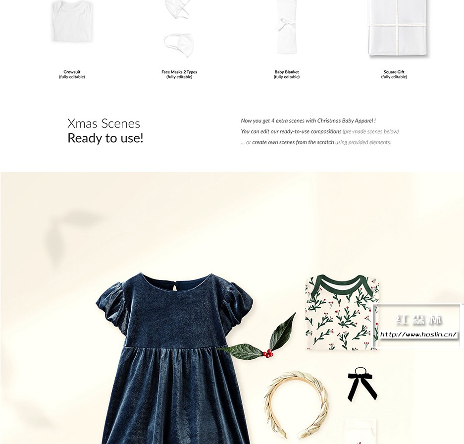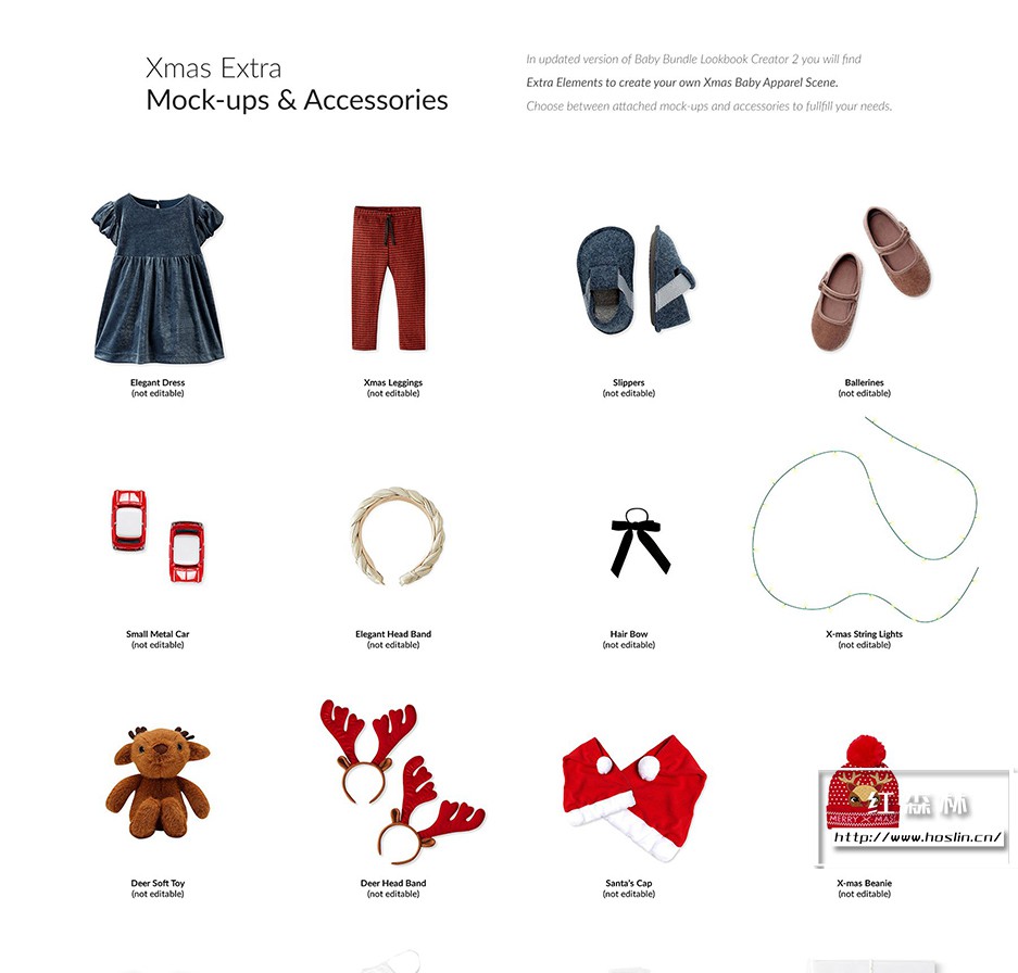 + Xmas Extra 在 Baby Bundle Lookbook Creator 2 的更新版本中,您会发现额外的元素来创建您自己的 Xmas Baby Apparel Scene。在附加的模型和配件之间进行选择,以满足您的需求。