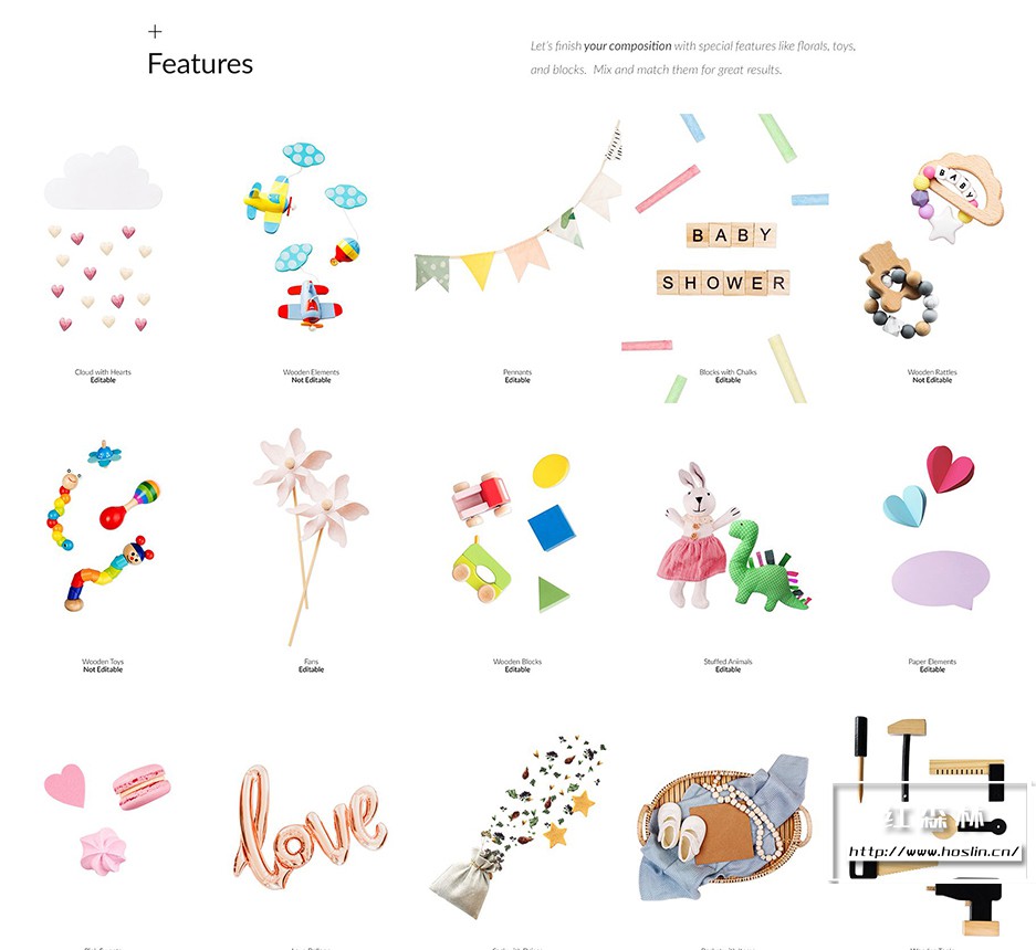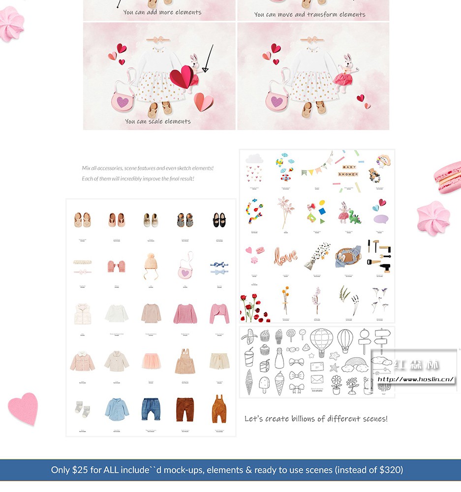 + 预制场景 随时可用! 使用“Baby Lookbook Creator Bundle”,您可以通过两种方式工作。您可以编辑我们现成的作品(下面的预制场景)……或使用提供的元素从头开始创建自己的场景。