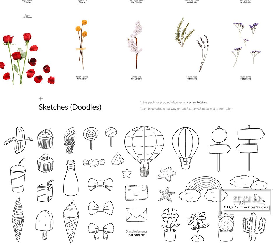 + 草图(涂鸦) 在包中,您还可以找到许多涂鸦草图。它可以成为产品补充和展示的另一种好方法。