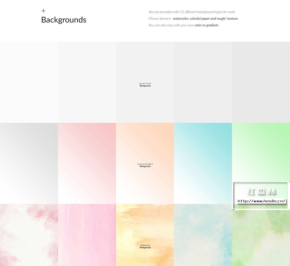 +背景 为您提供了 15 种不同的工作背景类型。选择:水彩、彩纸和粗糙/纹理。您也可以保留自己的颜色或渐变。