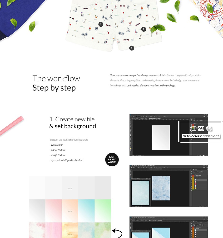 工作流程循序渐进 现在您可以按照您一直梦想的方式工作。混合搭配,享受所有提供的元素。现在准备图形真的很有趣。让我们从头开始设计您自己的场景,您可以在包中找到所有需要的元素