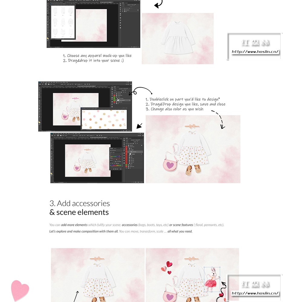 2. 选择模型和编辑颜色/设计 在分离的文件中,您会发现各种婴儿服装模型、配饰和场景属性的大集合。打开选定的 psd 文件,选择适当的文件夹,然后将其拖放到您的文件中,非非常简单。