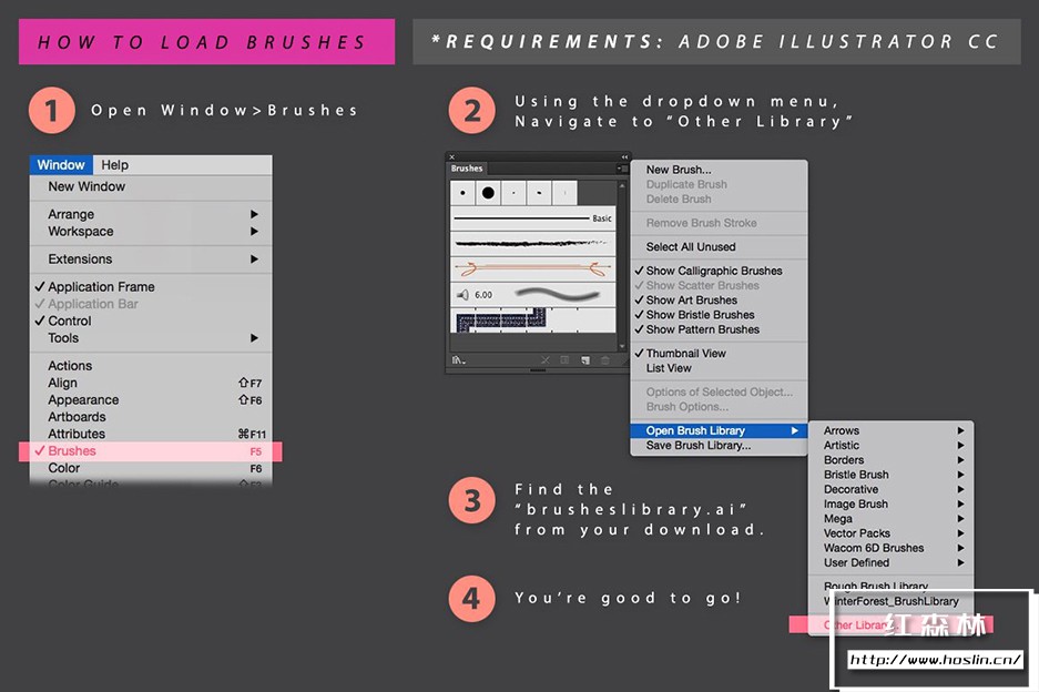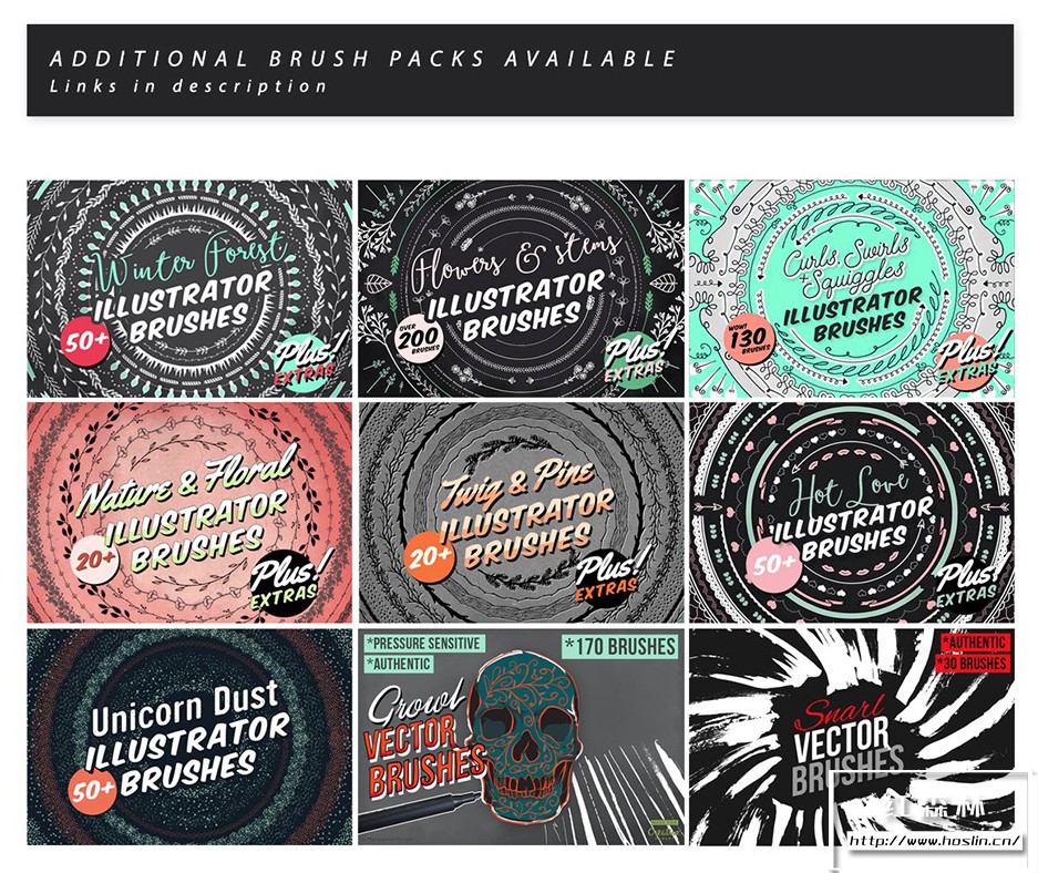 要求:Adobe Illustrator CC+。 旧版本的 Illustrator 将无法使用。此画笔包使用了仅与 CC 兼容的新技术。