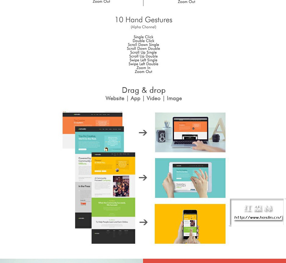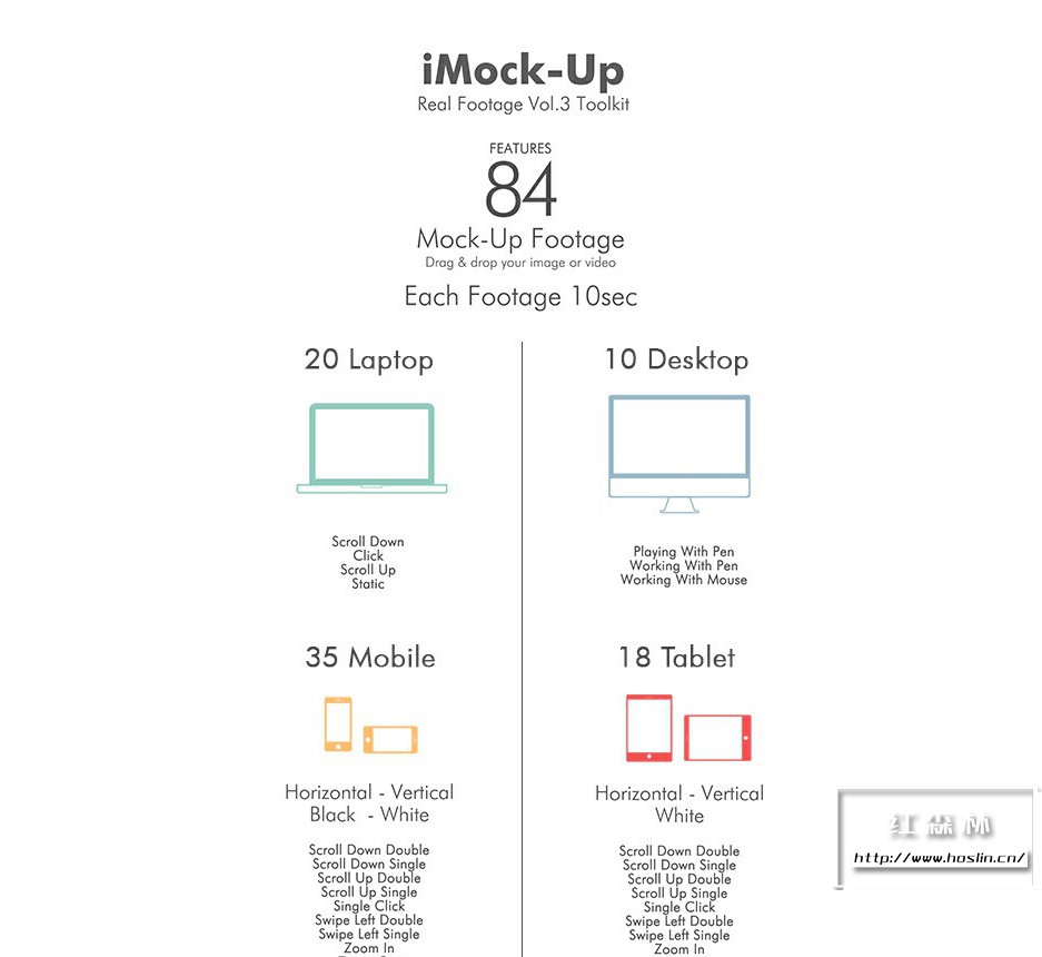 iMock-Up Real Footage Vol 3 工具包,包含 84个台式机、笔记本电脑、平板电脑和移动设备的模拟操作手势镜头动画。使用这些响应式设备电影镜头以帮助您宣传您的网站和应用程序。