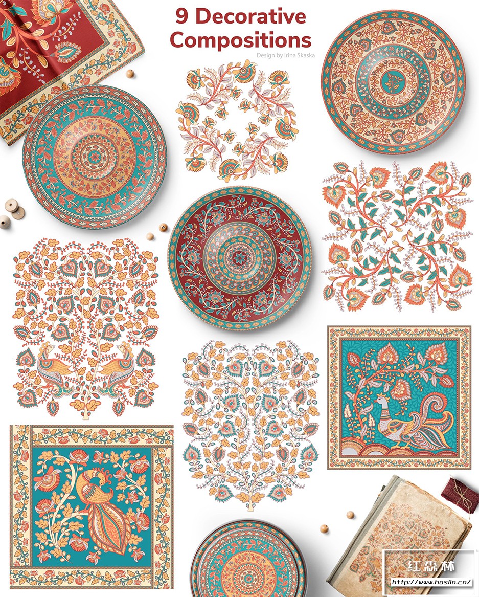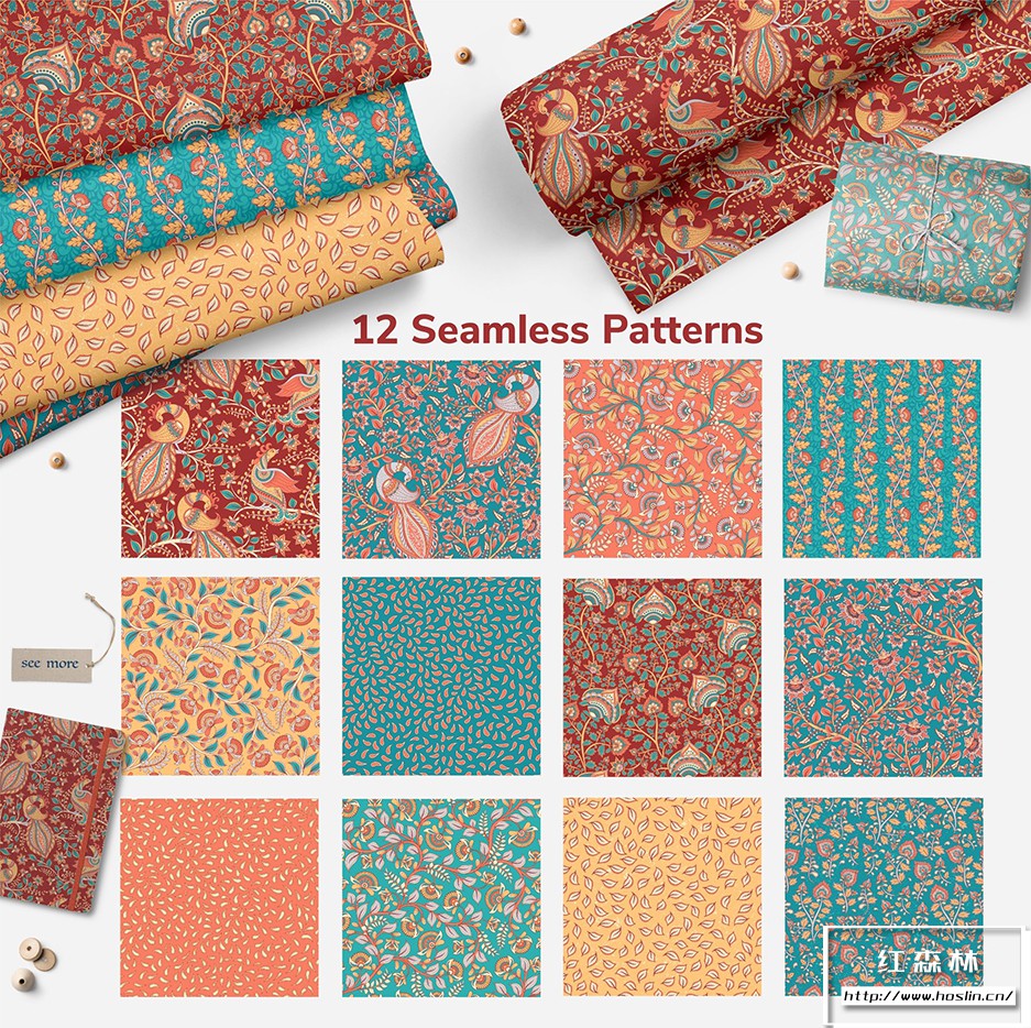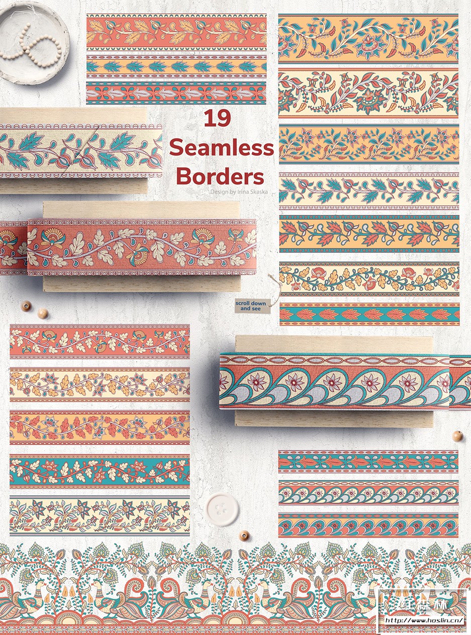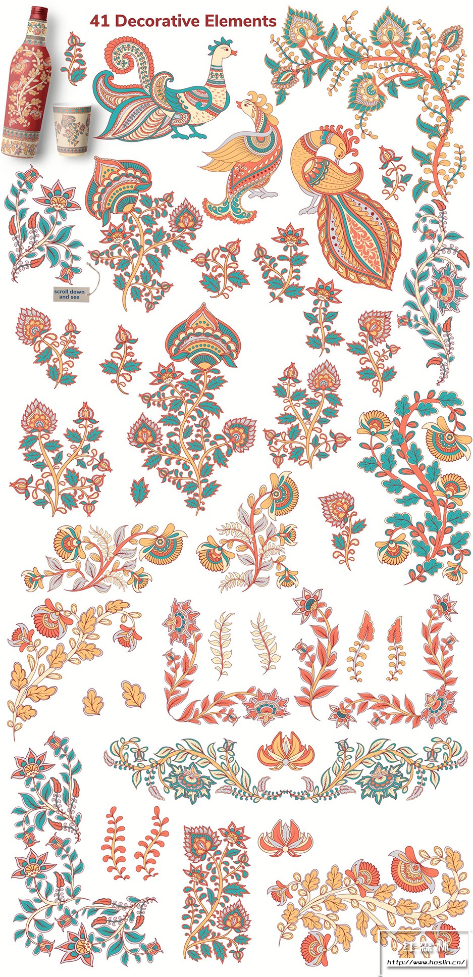 12个无缝图案,19个无缝边框,9 种原创装饰作品,20个装饰框架,41个装饰元素。