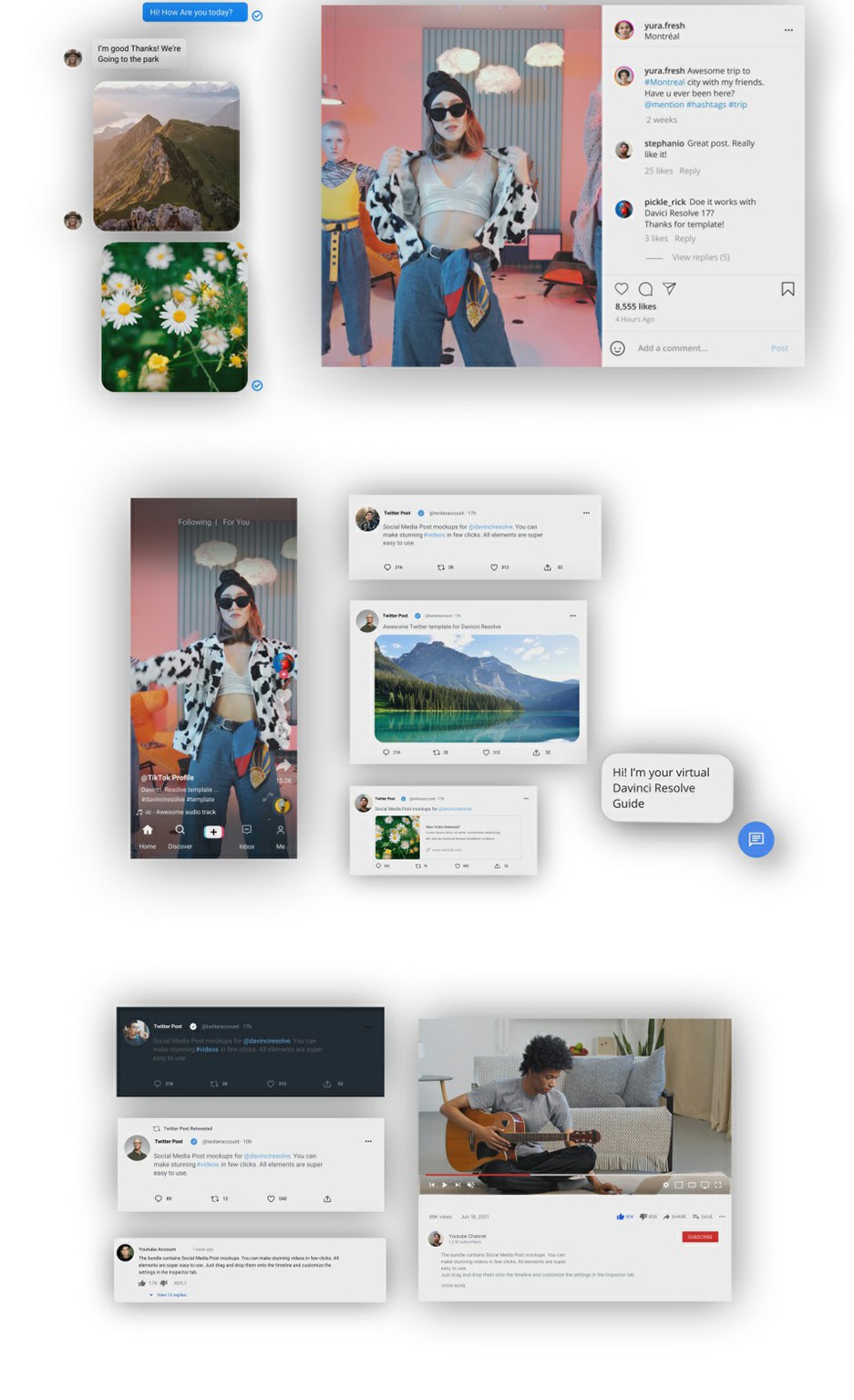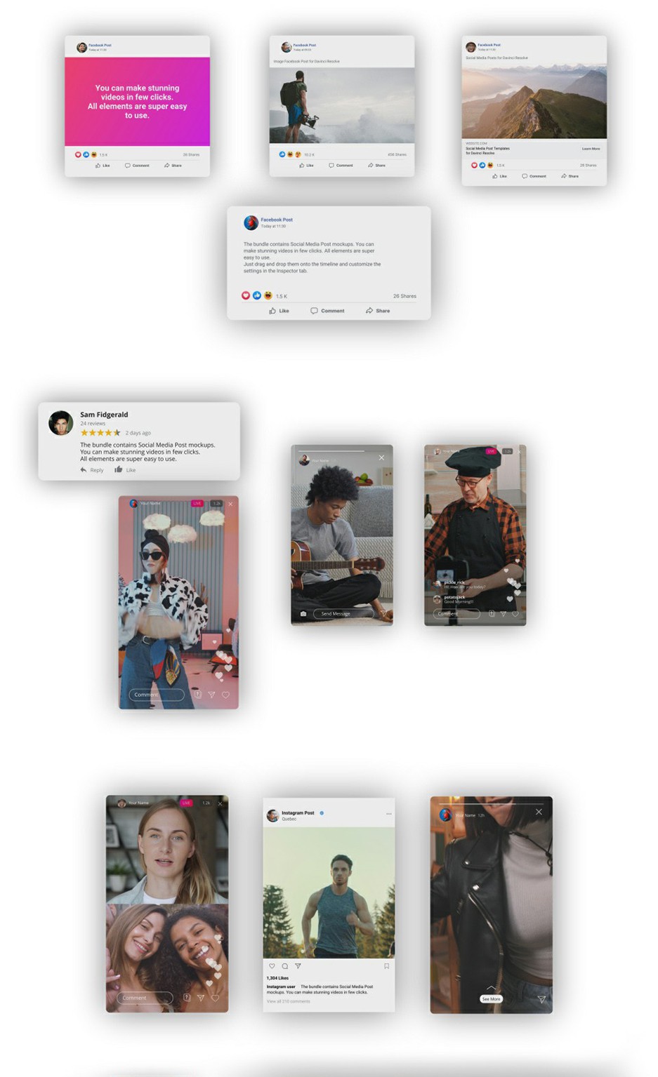 共包括 25 个帖子模板:Instagram、Facebook、Youtube、Twitter、Messanger、Instagram Stories、Instagram Live、Tik-Tok 等。4K分辨率,易于修改,无需插件,含使用教程。
