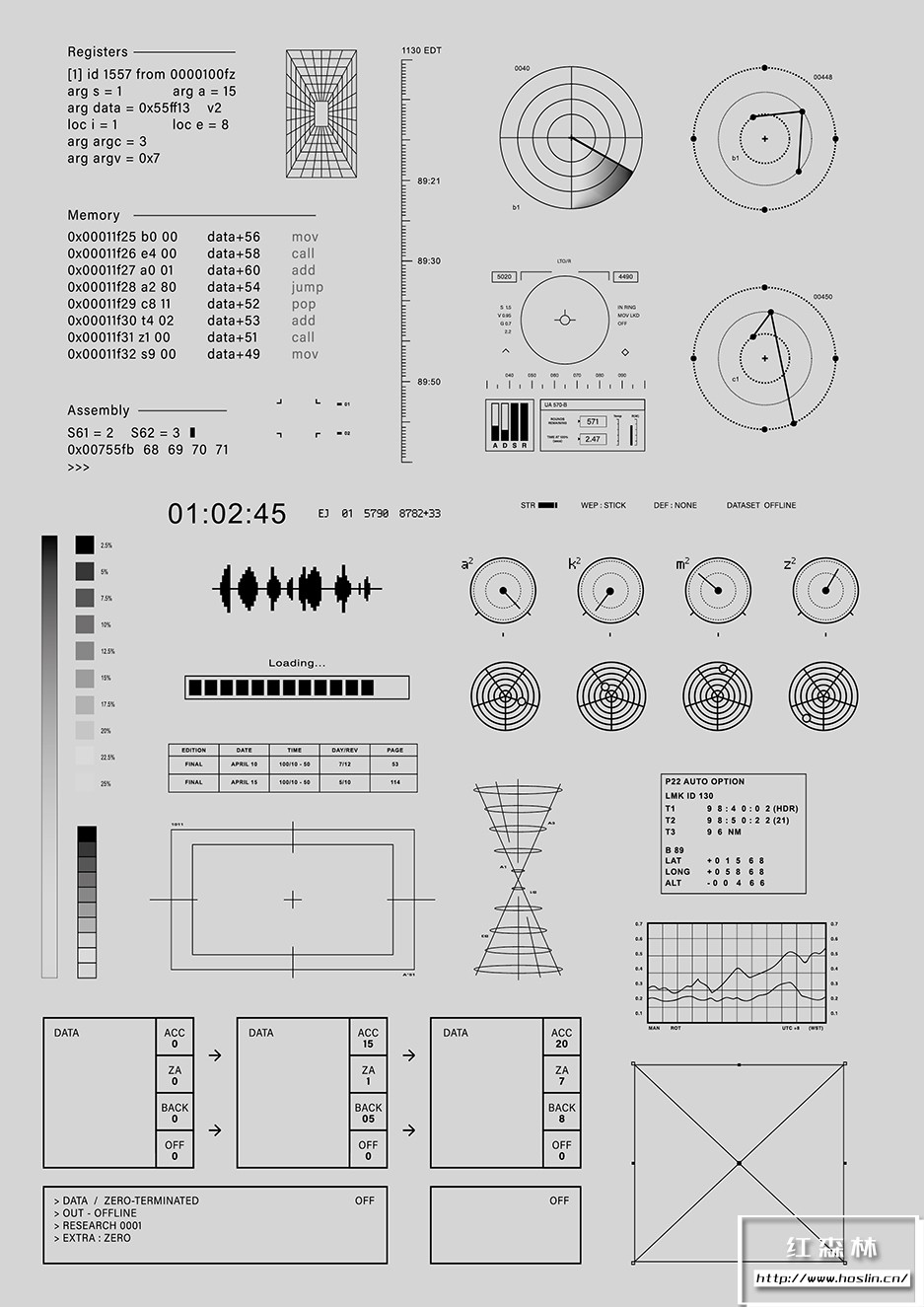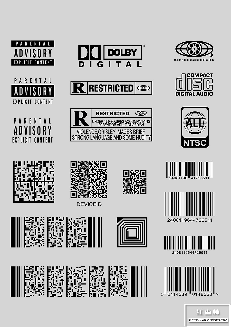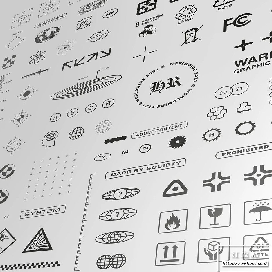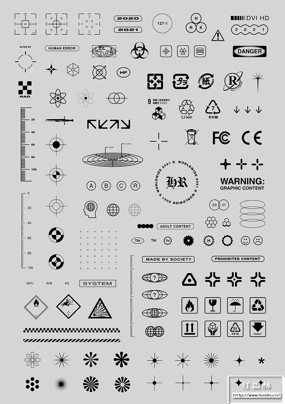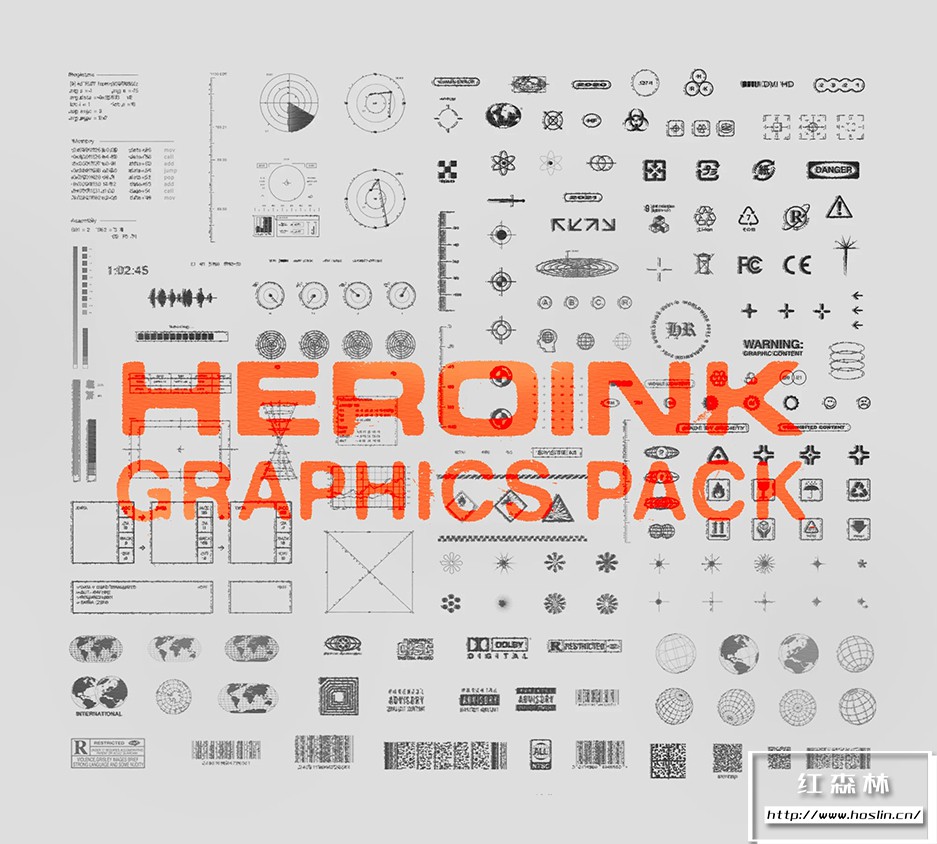 195个HUD线条地图包装标签条形码等线条元素纸张撕裂和噪点纹理素材 Heroink Graphics Pack