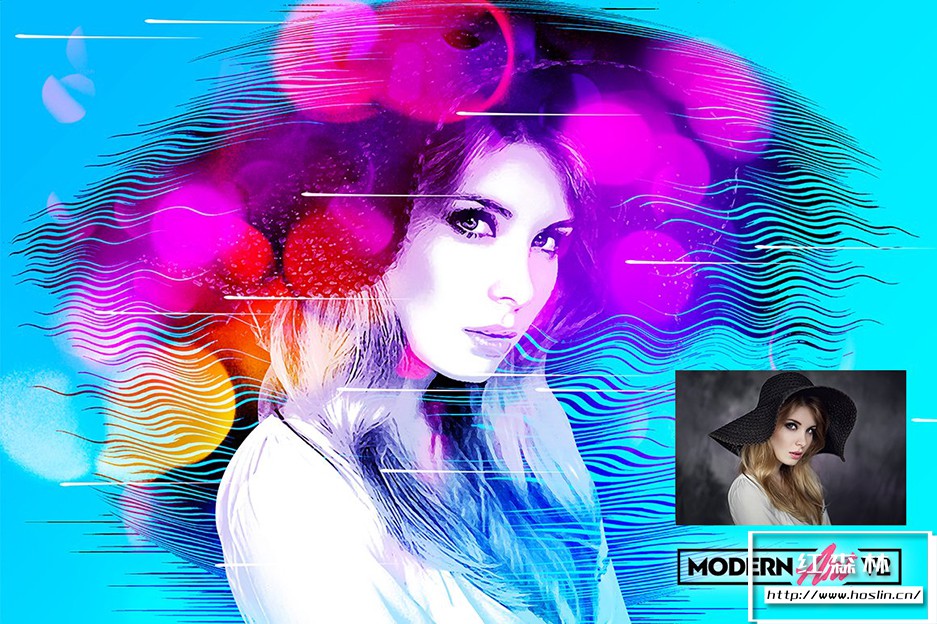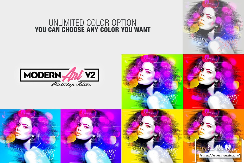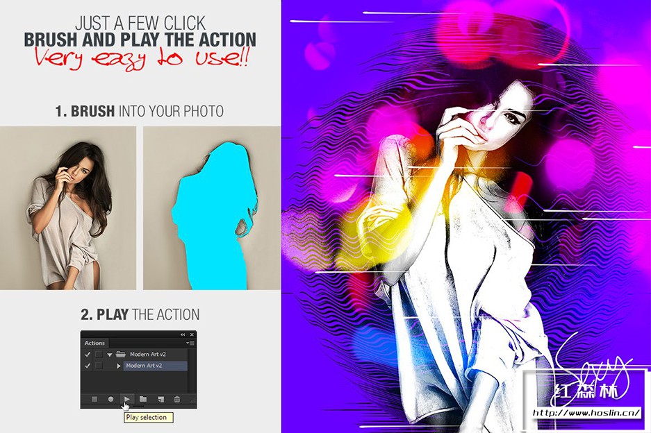 关于产品:现代水彩艺术画效果PS特效动作 Modern Art Photoshop Action v2,它非常易于使用,无需复杂操作,一键即可实现绚丽色彩的艺术画效果。与 Windows 和 Mac 兼容,适用于 Photoshop 英文版、CS6 及更高版本。包含视频教程。