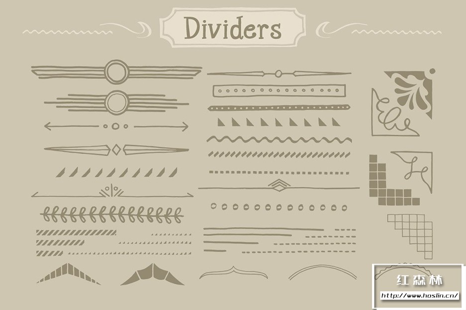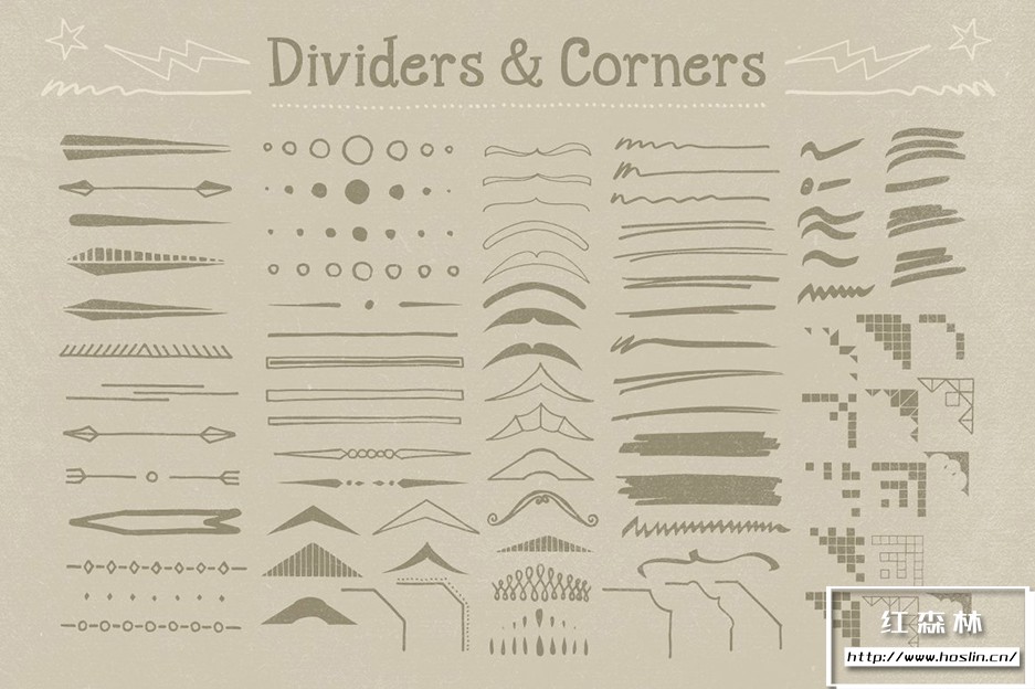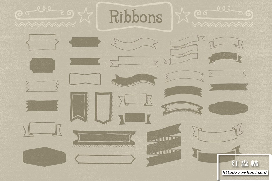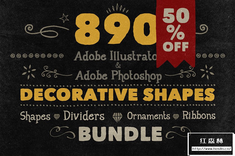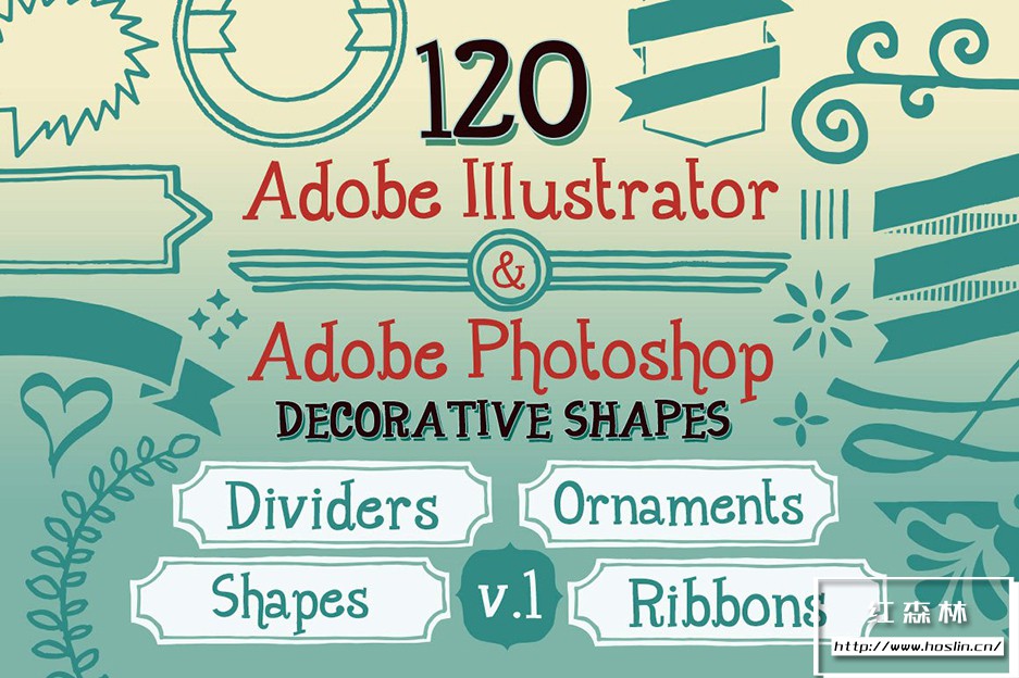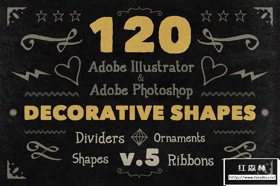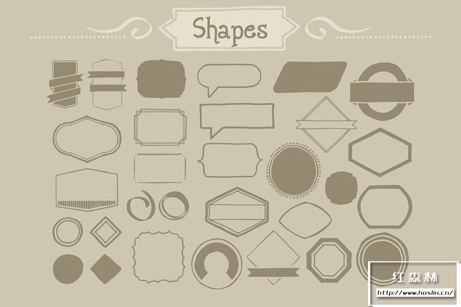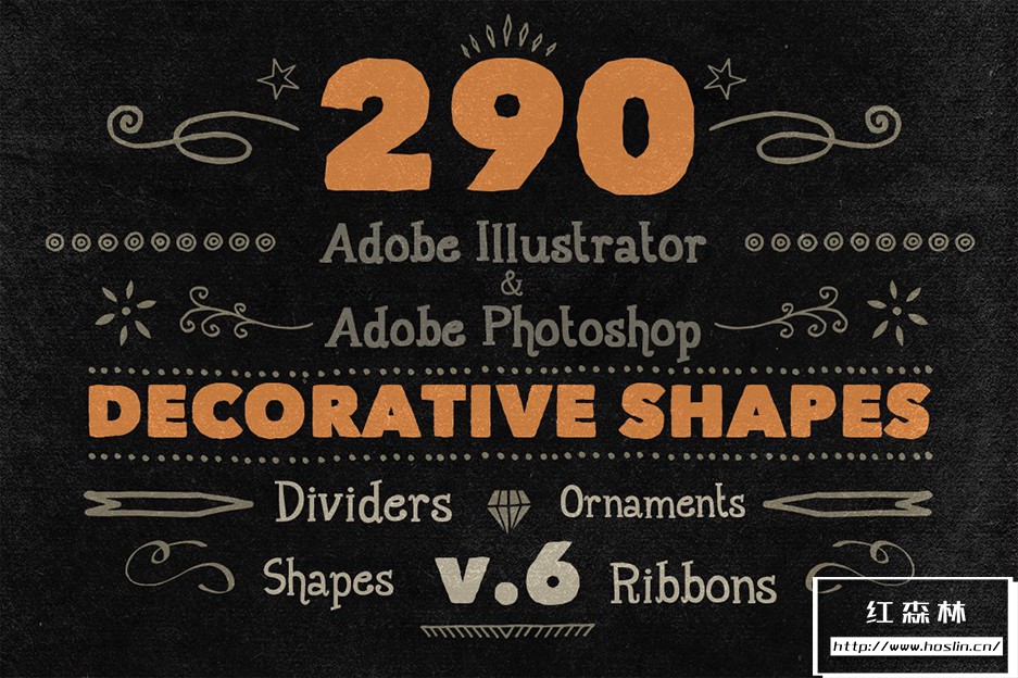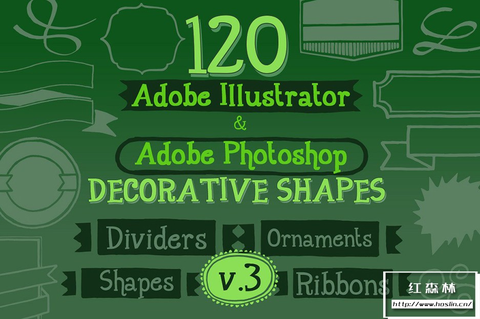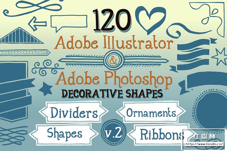 Adobe Illustrator 和 Adobe Photoshop 中的 890 个手写装饰矢量形状(可调整大小的形状)。丝带、分隔线、装饰品和角等形状。