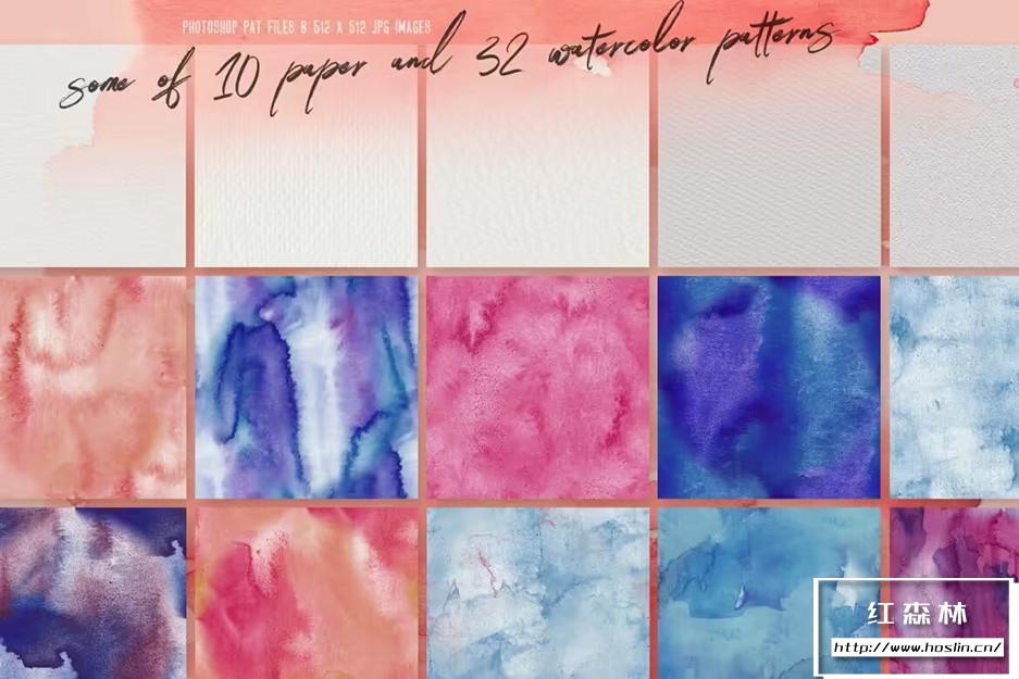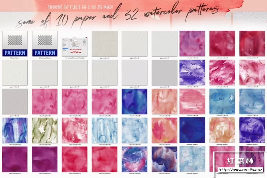 包含内容:32P 水彩JPG 512*512,2*PAT(PS图案文件)。