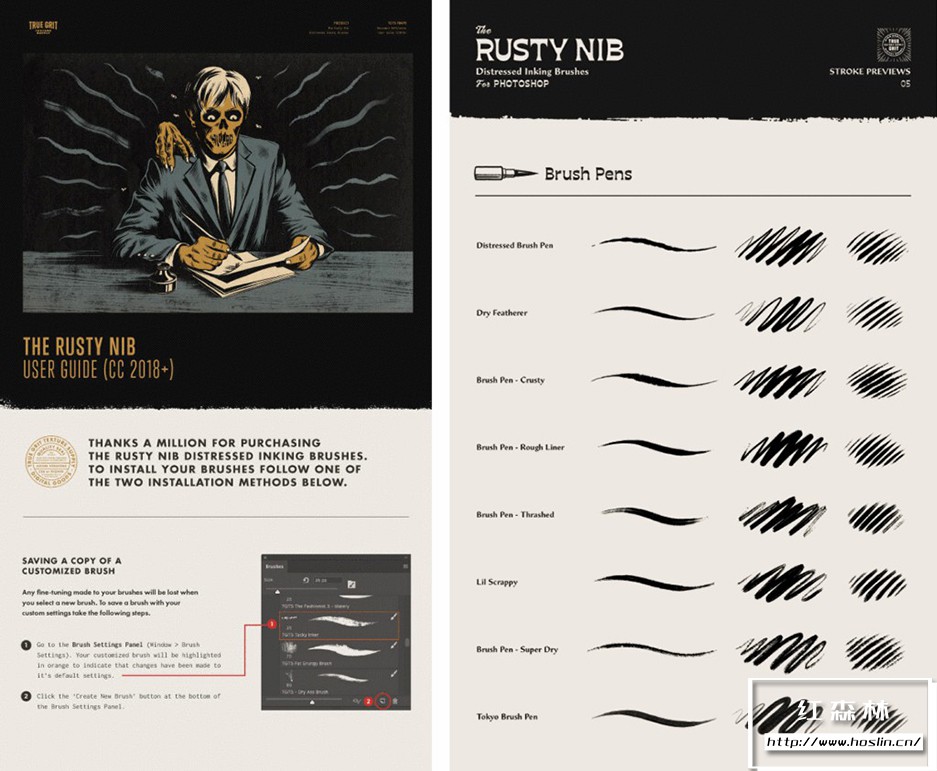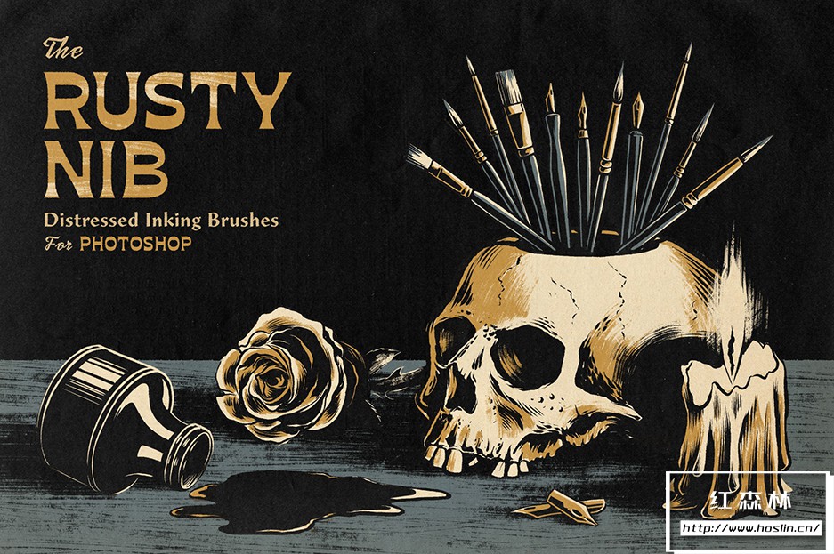 关于产品:The Rusty Nib for Photoshop,生锈的 Photoshop 笔尖,做旧的墨水刷。适用于Photoshop,也可用于Procreate 和 Affinity。