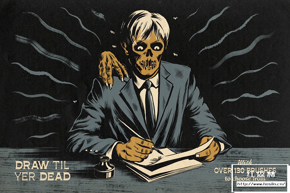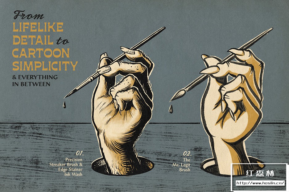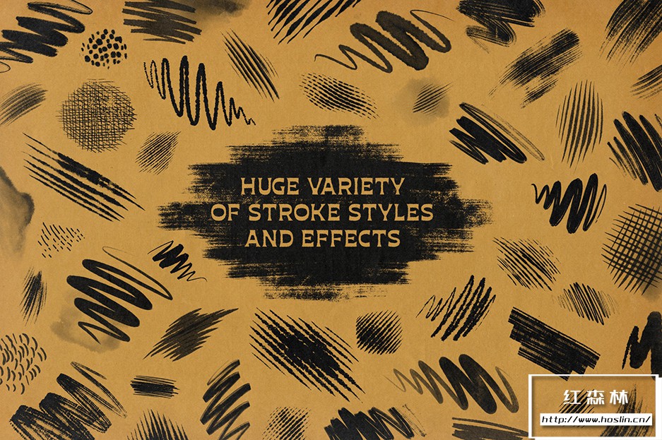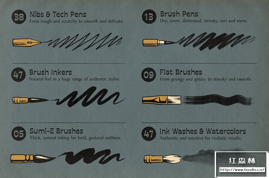 使用超过 130 种专业品质的 Photoshop 仿旧墨迹画笔,从粗糙和坚韧到光滑和细腻,以及介于两者之间的一切。