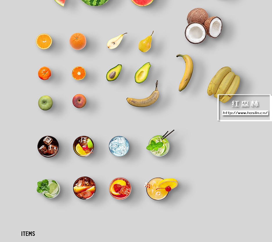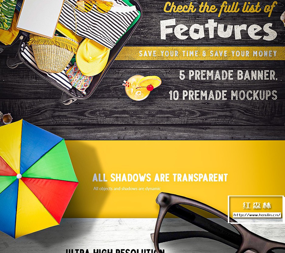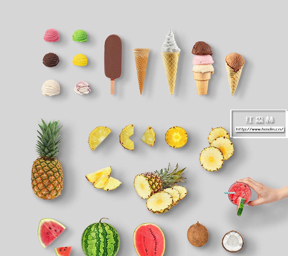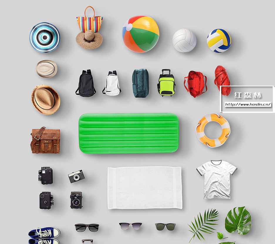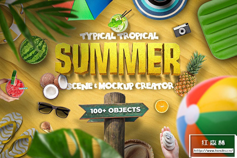 - 100 多个对象(PNG)如夏季水果,饮料,遮阳伞,沙滩排球,相机,背包,T恤,短裤,拖鞋,冰块,海螺贝壳,泳圈,墨镜,冰激凌,遮阳帽等等。