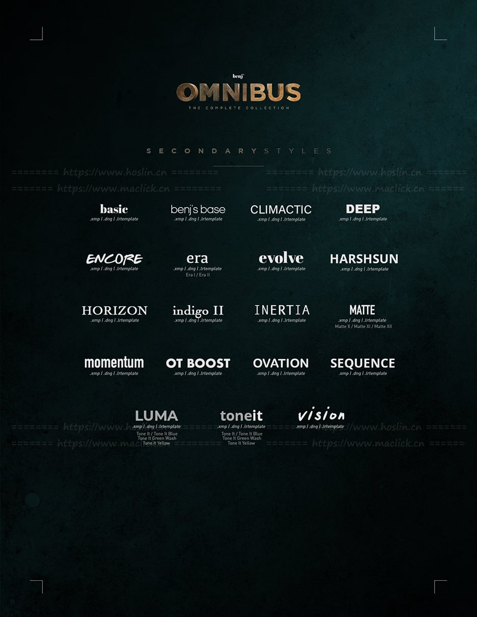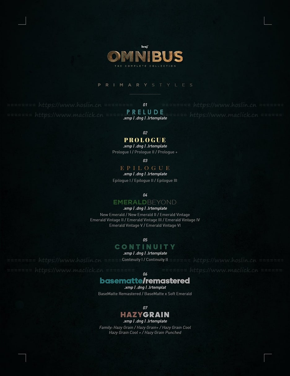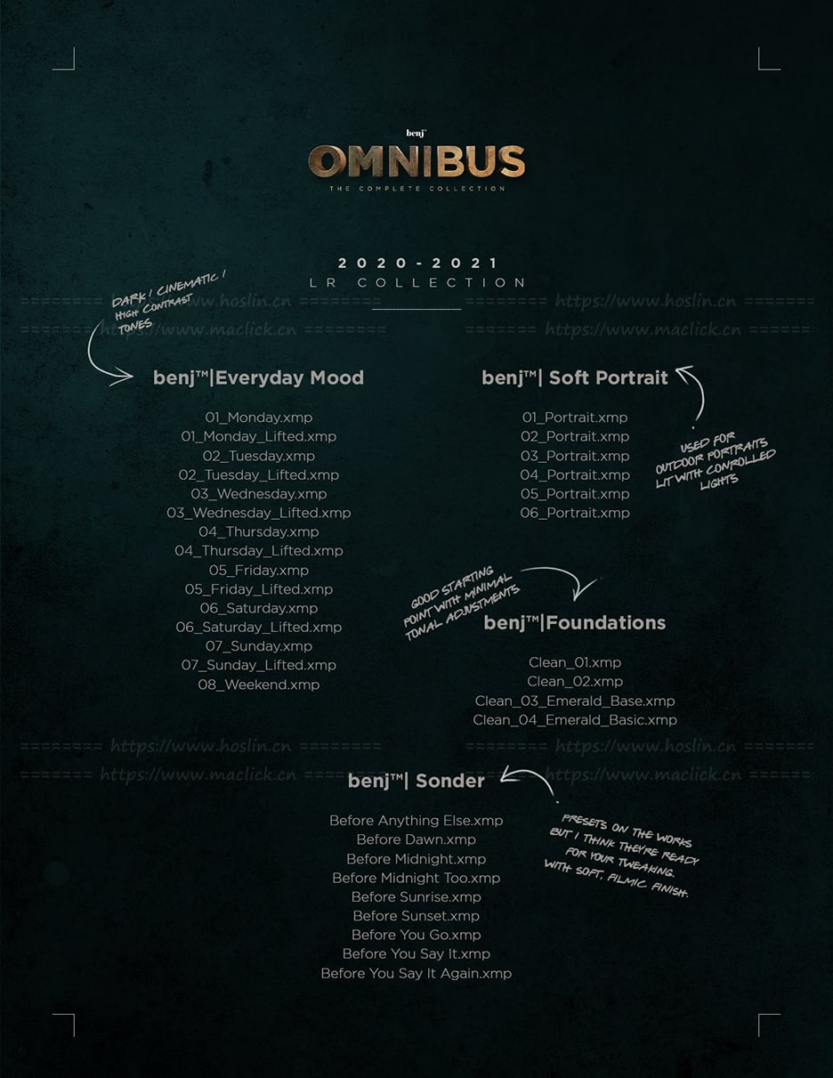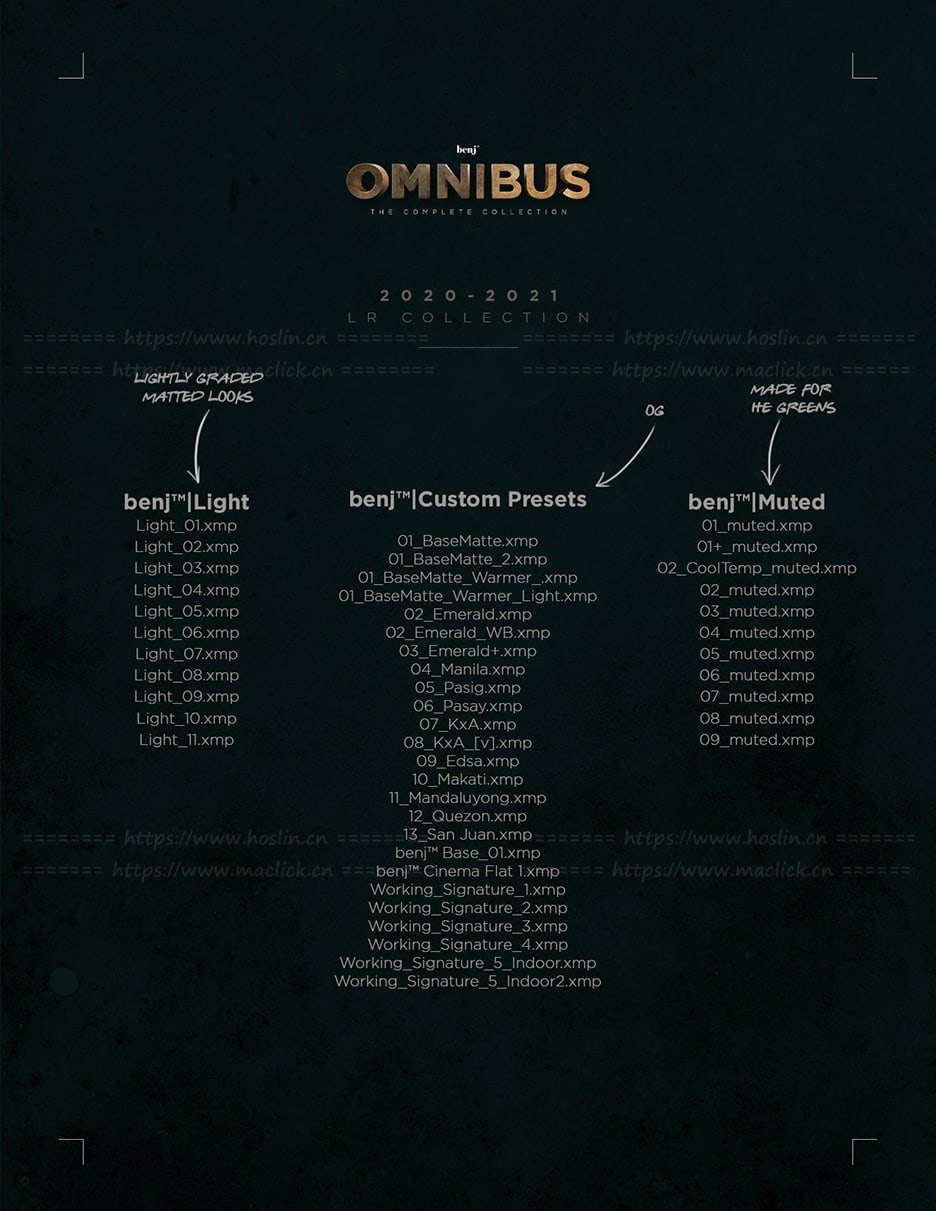 benj™ OMNIBUS (The Complete Collection) 是我的签名预设和 Luts的集合,适用于 Adobe Lightroom、Photoshop、Premiere Pro、After Effects 和 Davinci Resolve。它有超过 100 个预设和 17 个 Lut,所有这些都是多年来积累的。