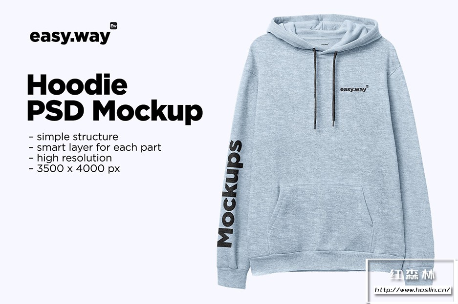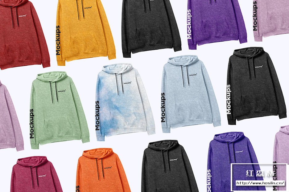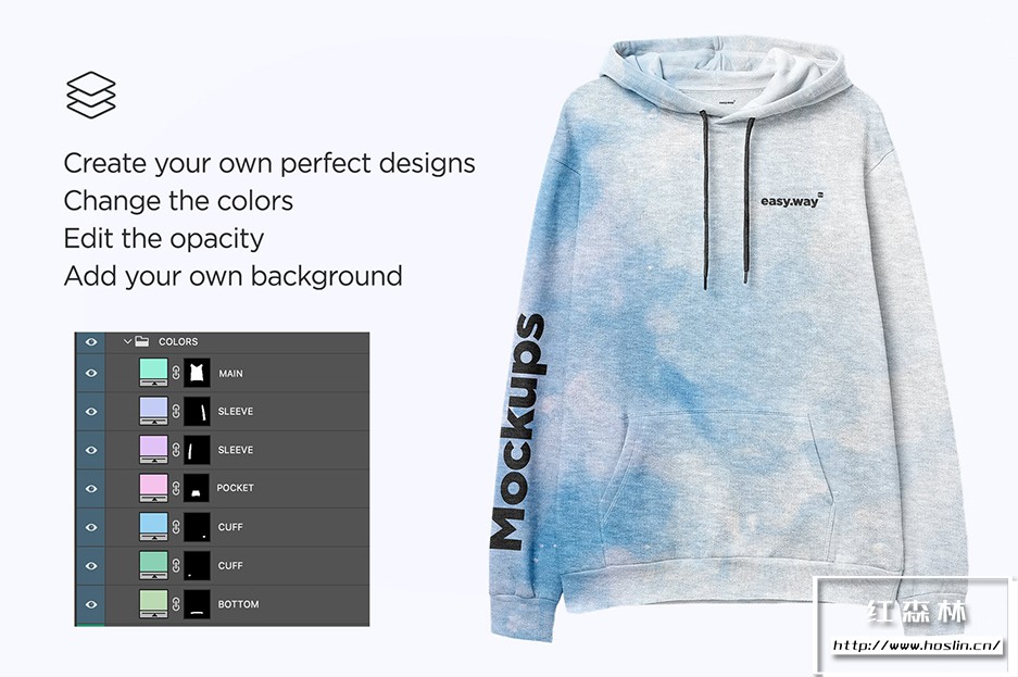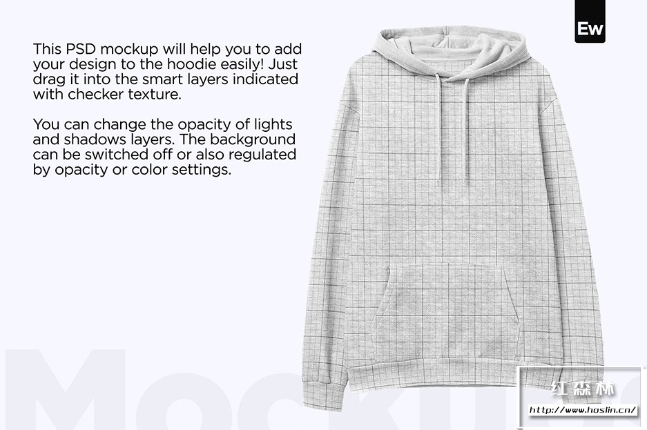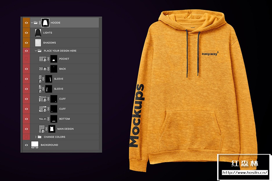 如何工作:打开模型文件,选择 PLACE YOUR DESIGN HERE 图层组,选择智能对象并单击两次。将您的设计拖到打开的文档中。保存并关闭。看看结果!对其余的智能层重复该操作。您可以更改 LIGHTS 和 SHADOWS 图层的不透明度。背景颜色可以更改为您喜欢的任何颜色。如果您希望设计元素与连帽衫具有相同的石南花纹理,请将 SMART LAYERS 图层组移至 HOODIE 图层组。