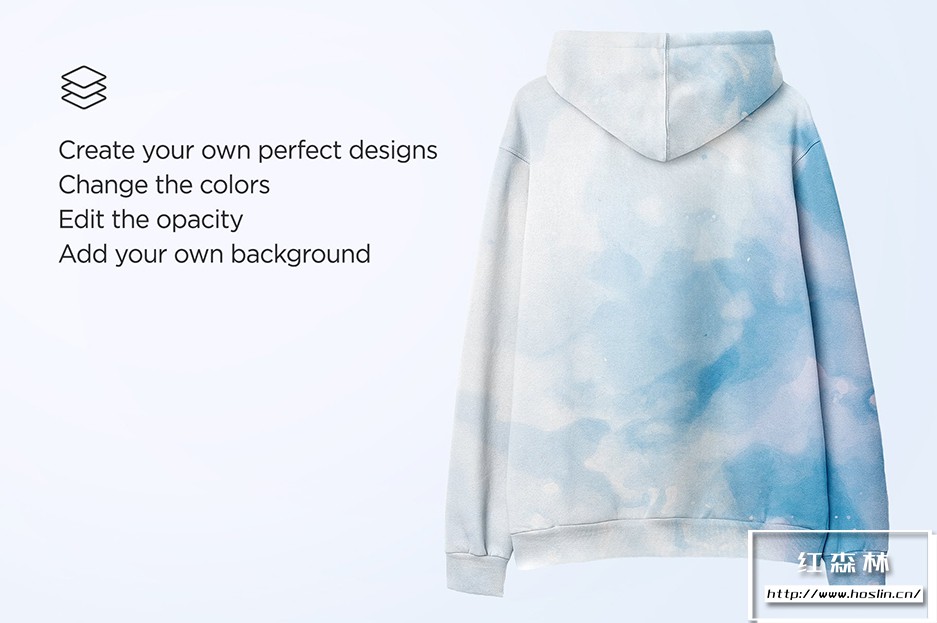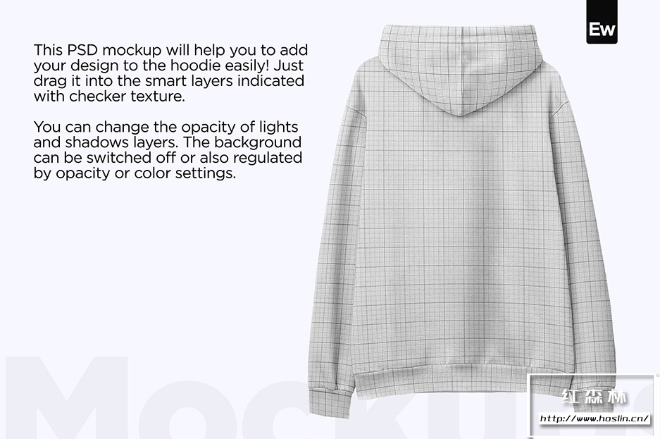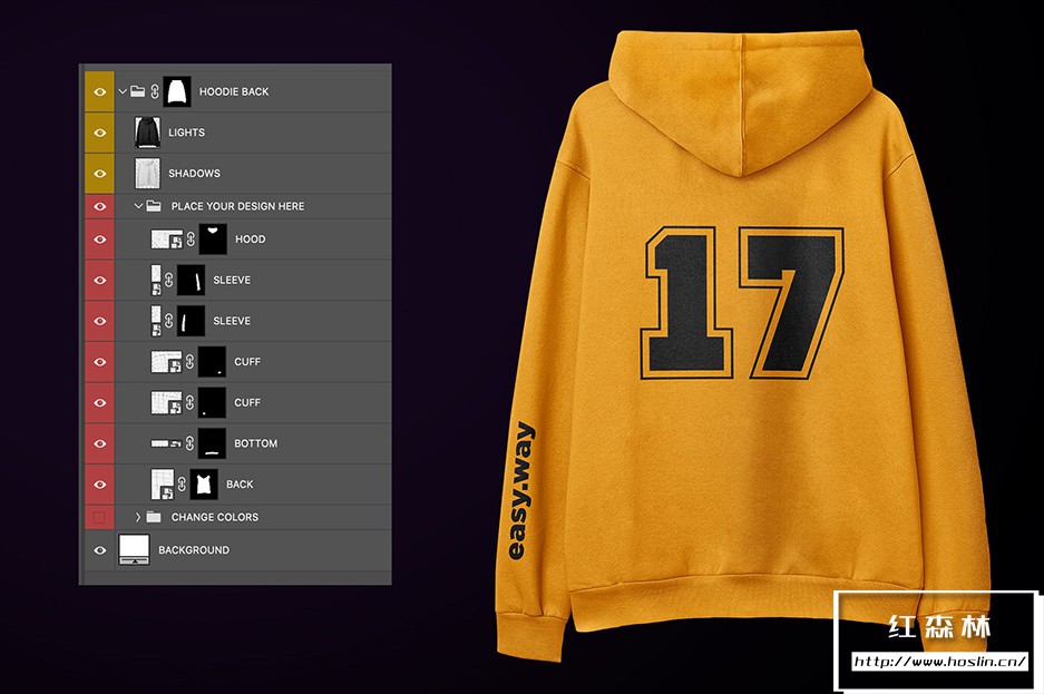 如何工作:打开模型文件,选择 PLACE YOUR DESIGN HERE 图层组,选择智能对象并单击两次。将您的设计拖到打开的文档中。保存并关闭。看看结果!对其余的智能层重复该操作。您可以更改 LIGHTS 和 SHADOWS 图层的不透明度。背景颜色可以更改为您喜欢的任何颜色。如果您希望设计元素与连帽衫具有相同的石南花纹理,请将 SMART LAYERS 图层组移至 HOODIE 图层组。