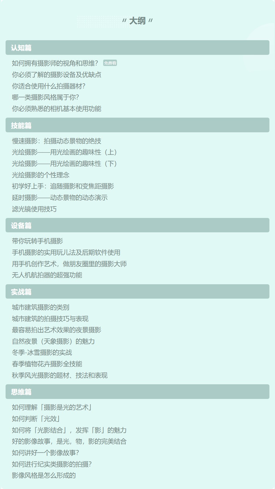 我们帮你请来了美国国际摄影展览金牌奖得主、中国摄影金像奖提名得主杨晓利,35 年摄影教学经验的他,为你带来 30 节真正的摄影课。教你学会使用摄影器材,掌握摄影实用技能, 拥有摄影大师的思维方式、观察方法,形成个性的摄影风格!
