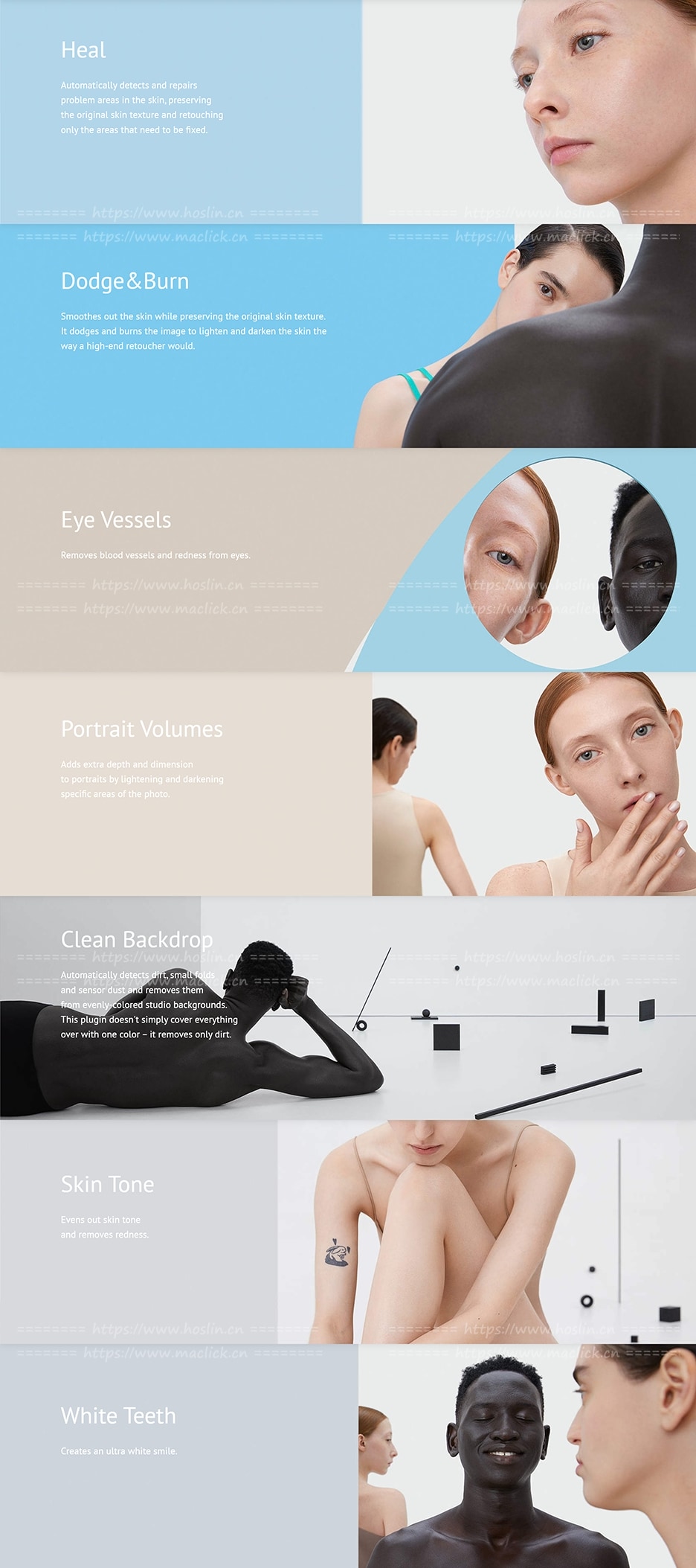 - 高端皮肤修复:Retouch4me Dodge&Burn 使用高端修饰器使用的减淡和加深技术自动修饰人像。