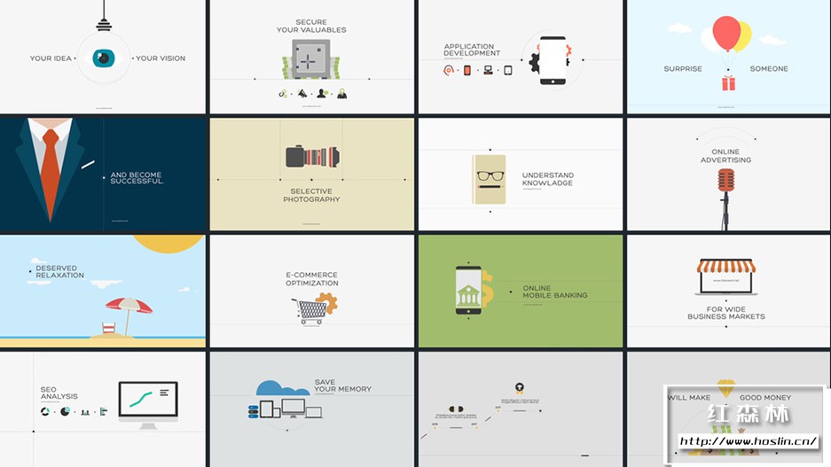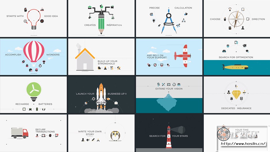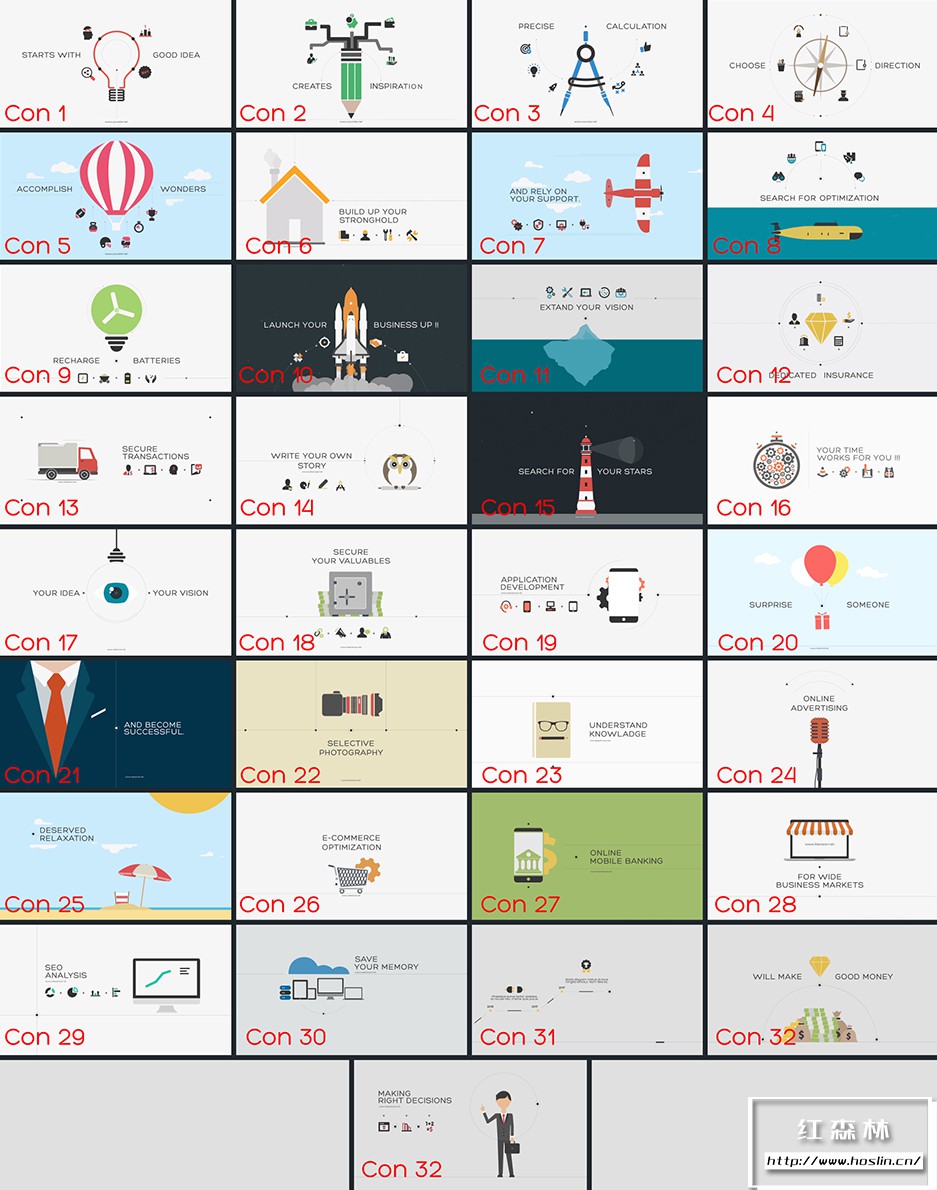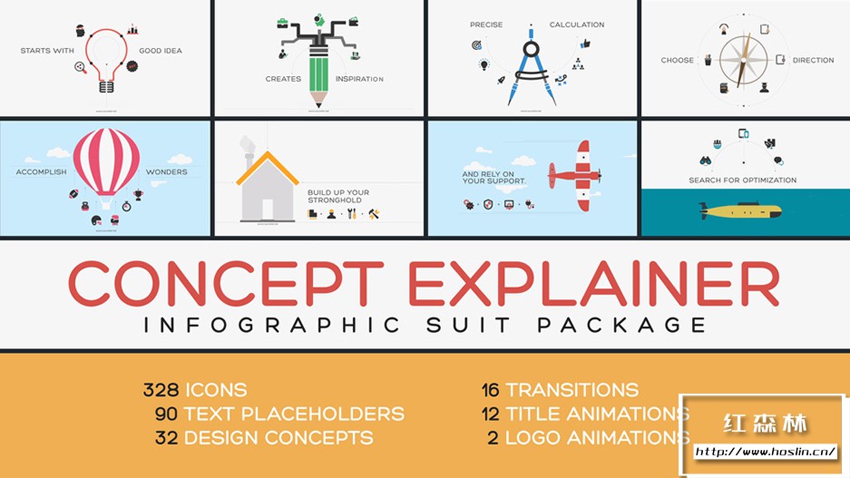 包含内容:2个标志动画;32个设计理念;328个图标(分为图标类别);90 个文本占位符;12 个标题动画;16个过渡;5个预制促销;包括详细的视频教程。