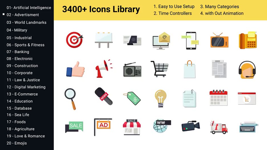 拥有52个类别超过3400个图标动画,适用于 After Effects CC 2019 及更高版本。易于使用的单独文件,包括预览库和含语音的视频教程。