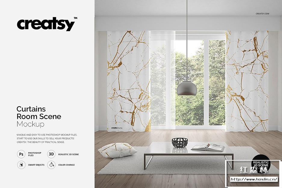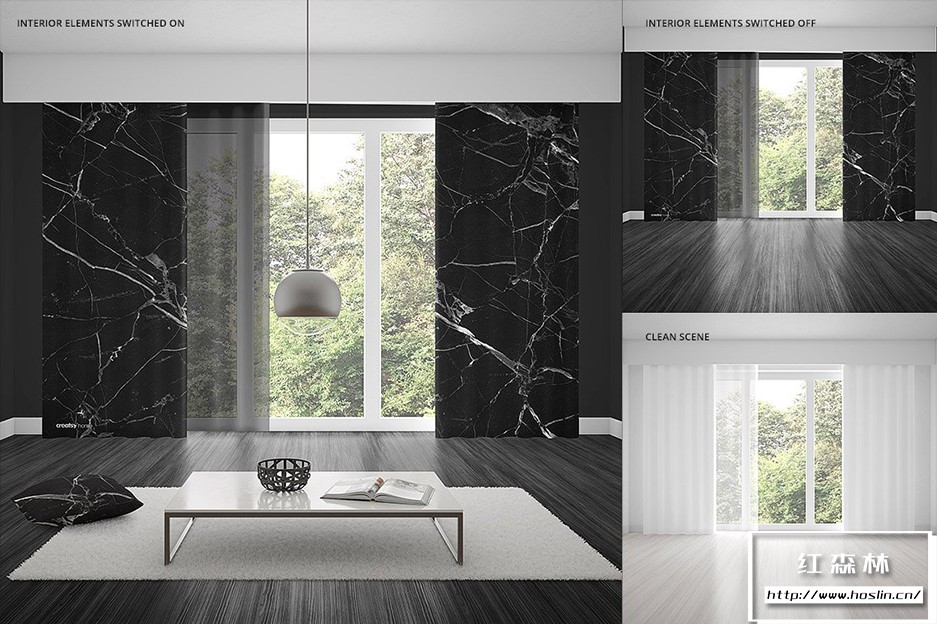 窗帘房间场景模型 Courtains 房间场景模板 – 分层、可编辑的 psd 文件准备展示您的自定义设计,只需编辑智能对象和颜色层。