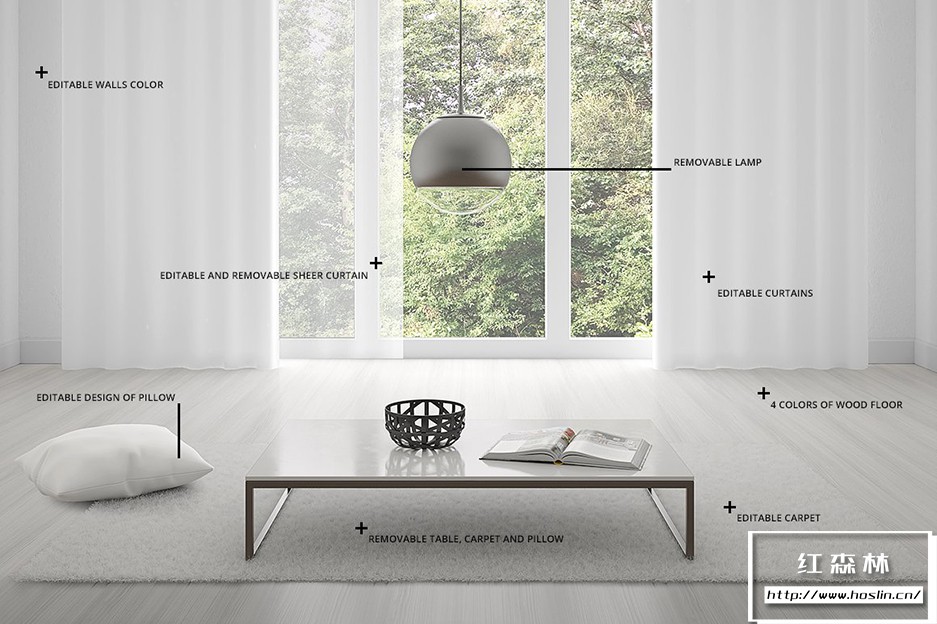 您可以打开/关闭元素,例如:灯、桌子、地毯、枕头、透明窗帘;