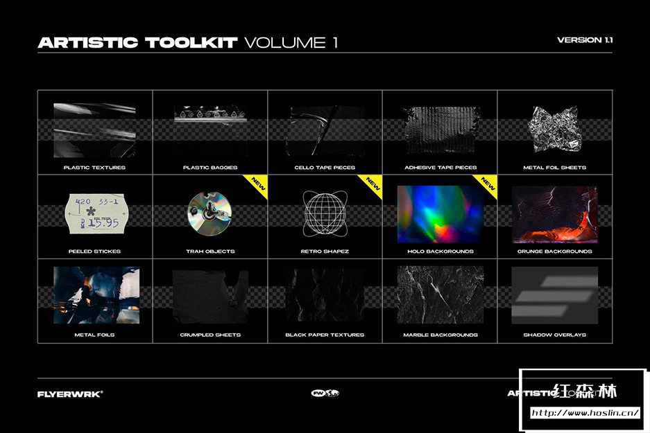 这汇集了从我们一些最重要和最珍贵的系列中提取的优质物品,例如 Plastik、Crumpled Paper Sheets、Kortine、Alumen、Grunge 和胶带件,以供立即使用。