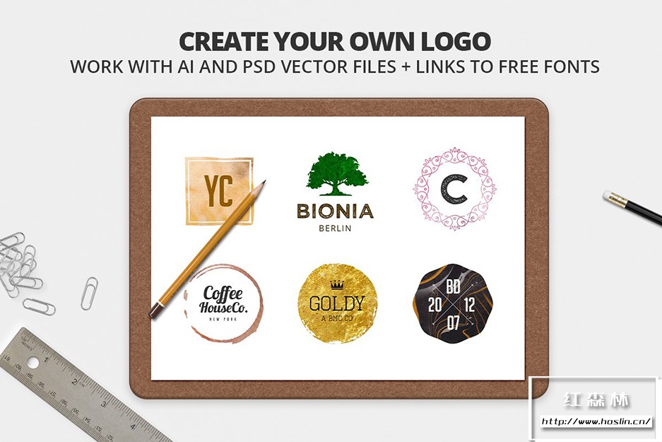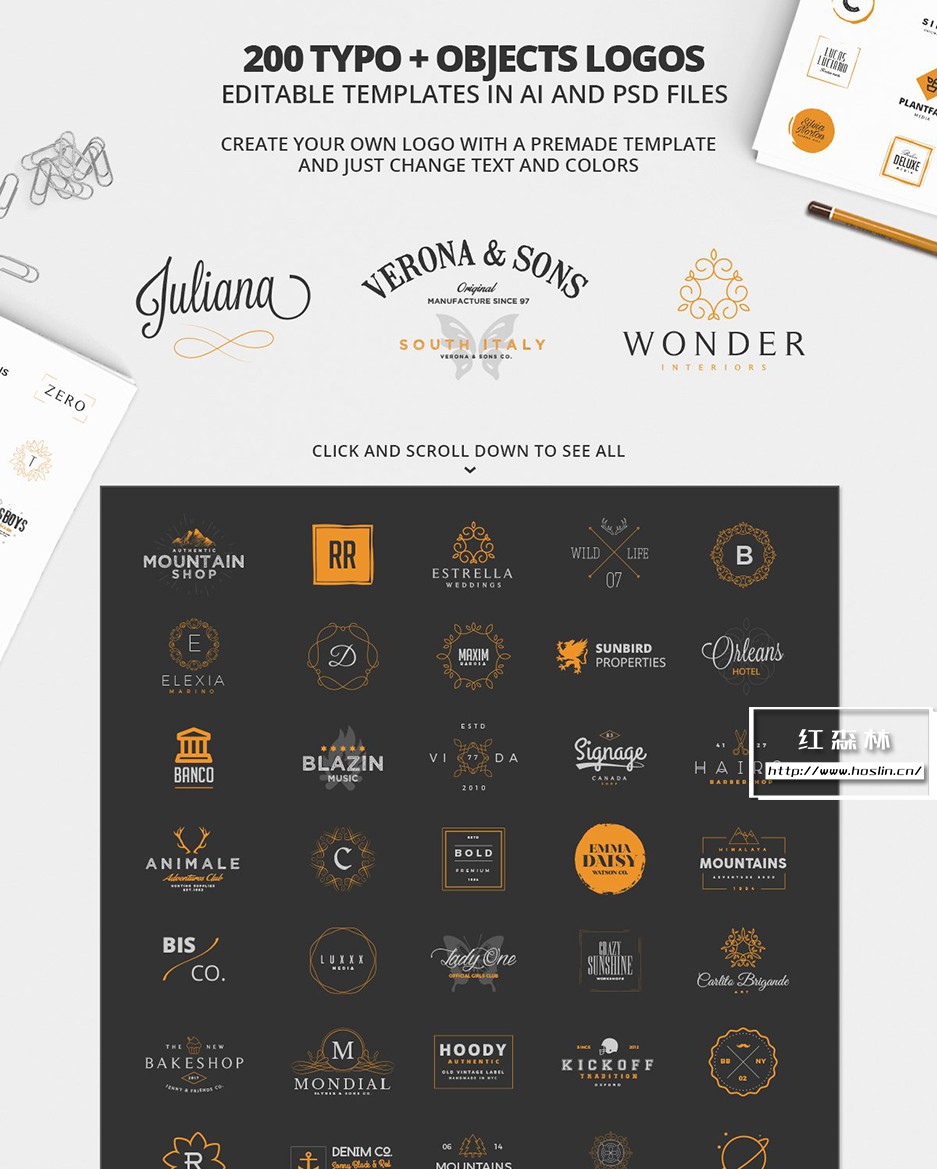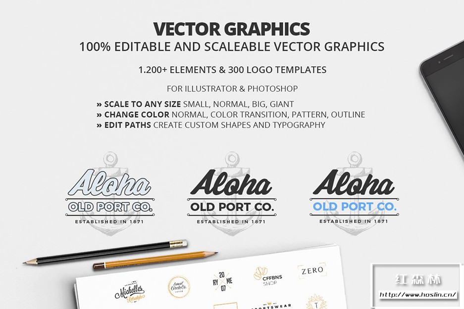 使用多合一徽标创建工具包,您可以在几分钟内为任何类型的企业创建独特的徽标。从面包店、餐厅或理发店等小型企业到大品牌 – 此徽标创建工具包非常适合所有平面设计师或具有一定设计技能的人。使用它所需的只是一个图形程序,如 Adobe Illustrator 或 Photoshop(Mac 或 PC)。使用 1200 多个图形元素和 70 种建议的免费字体创建令人惊叹的专业徽标。如果您想节省一些时间,只需编辑已包含的 300 个徽标模板之一。所有元素和徽标都组织为清晰的 ai 和 psd 文件中的可编辑矢量图形。徽标完成后,您可以看到它在现实环境中的工作原理,并使用 30 个逼真的模型之一将其展示给您的客户或您的朋友和家人。