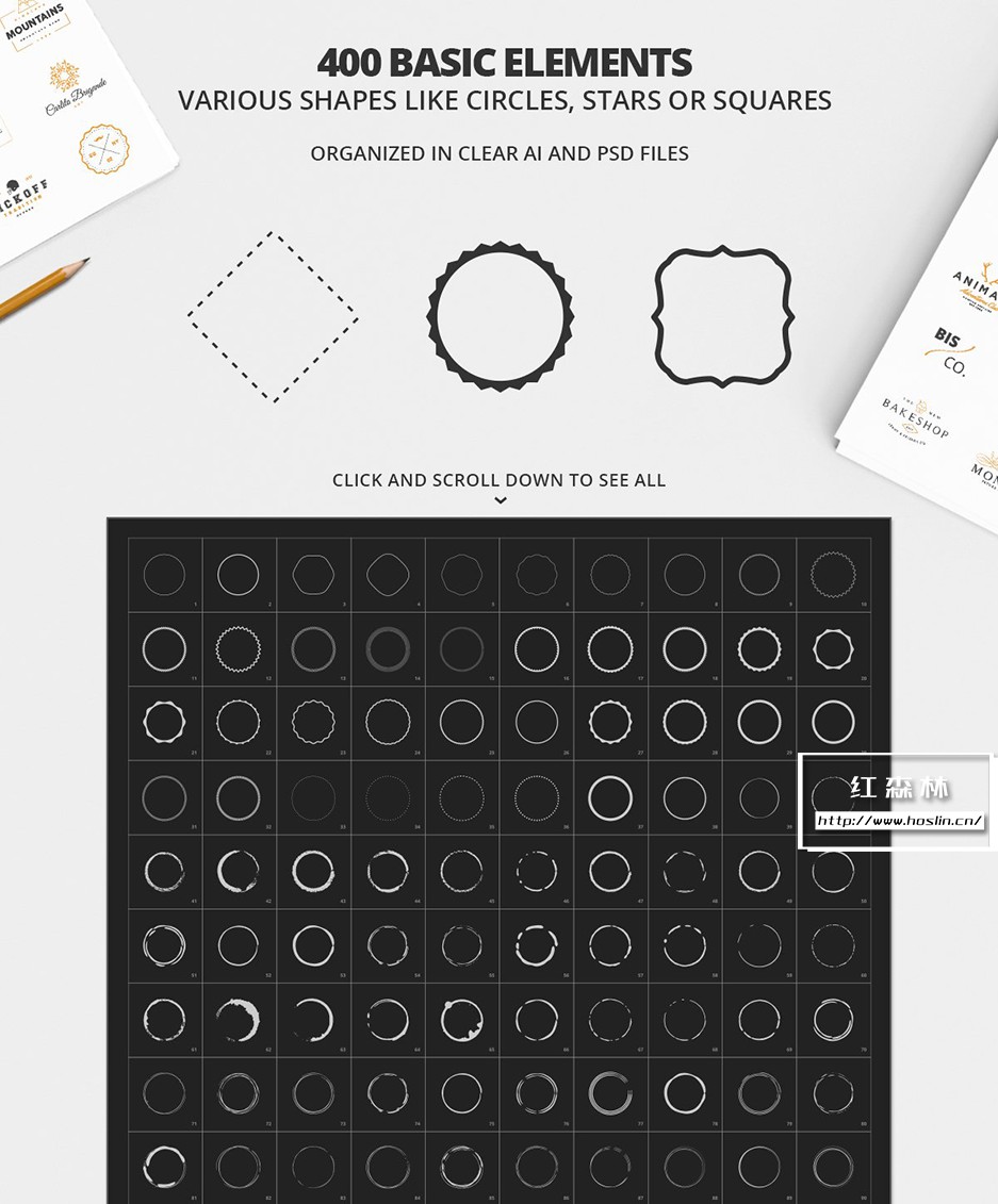 - 400 个基本元素,包括 形状,徽章,框架,…