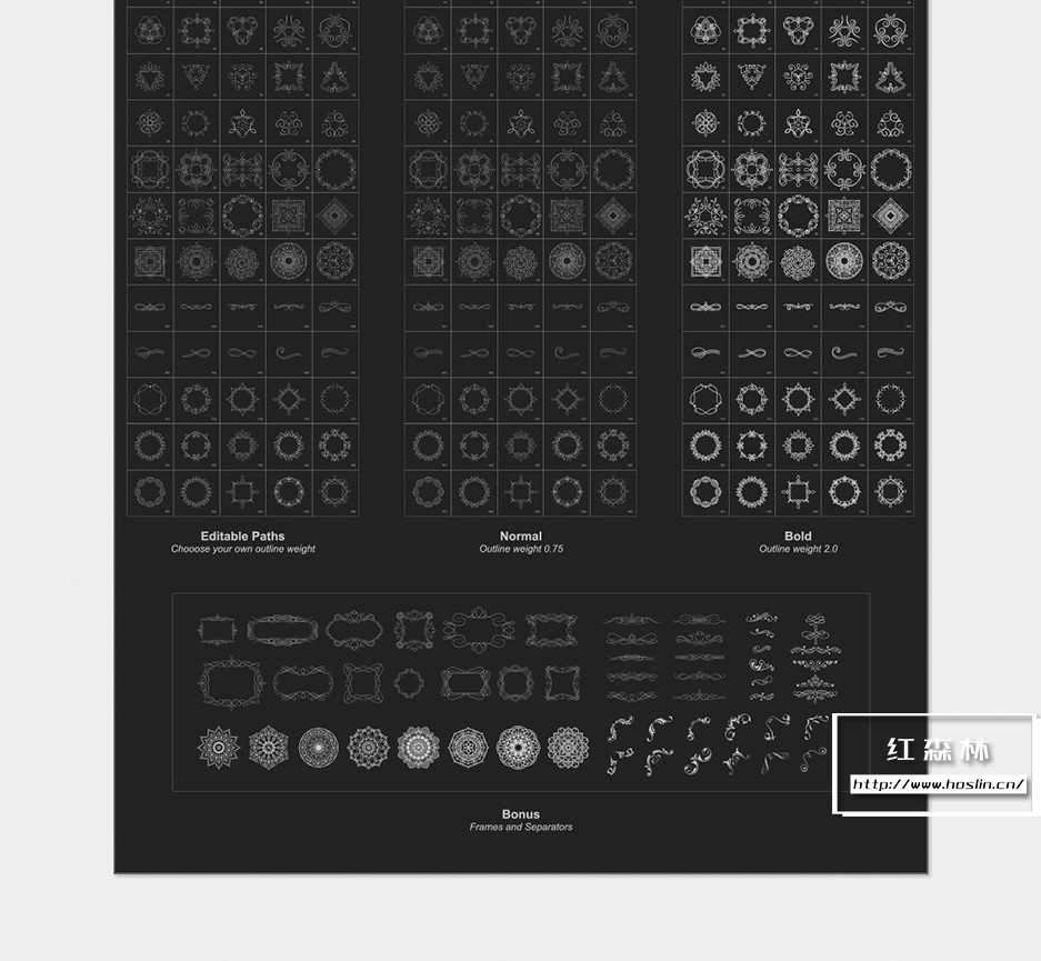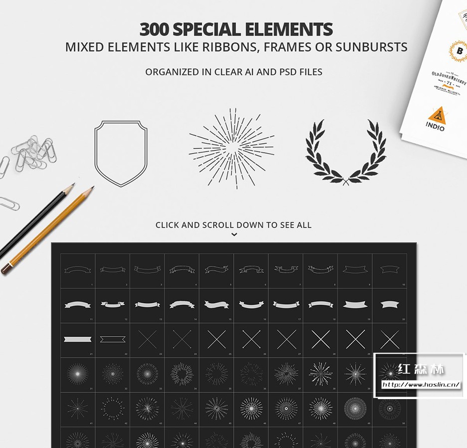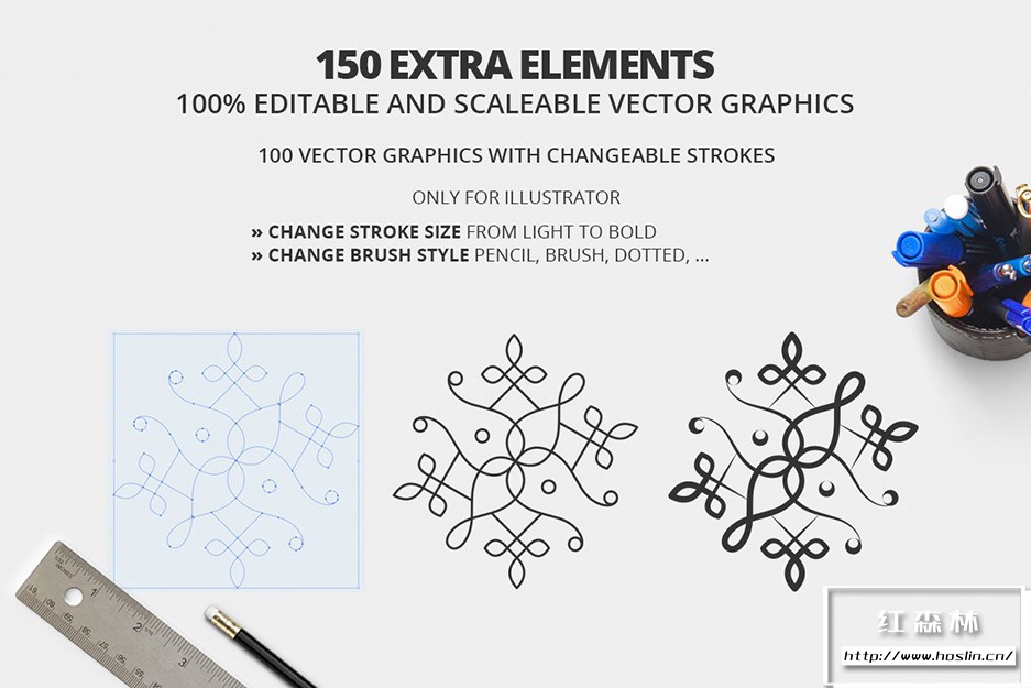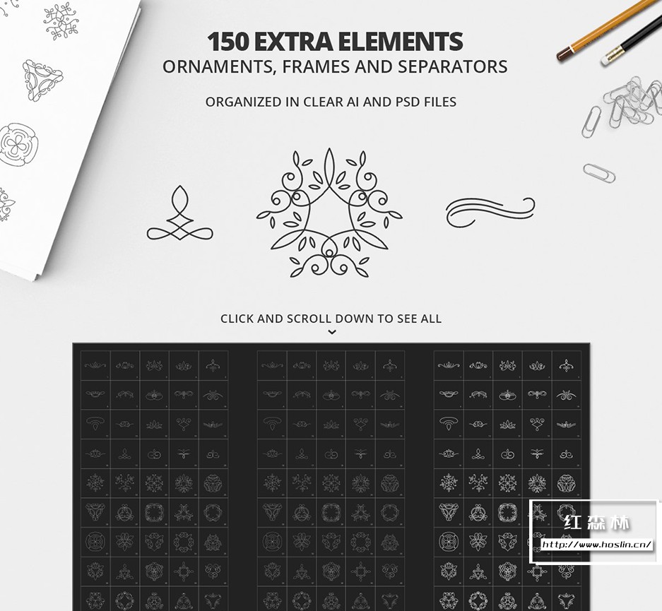 - 150 个额外元素,包括 装饰品、书法元素、分隔符……