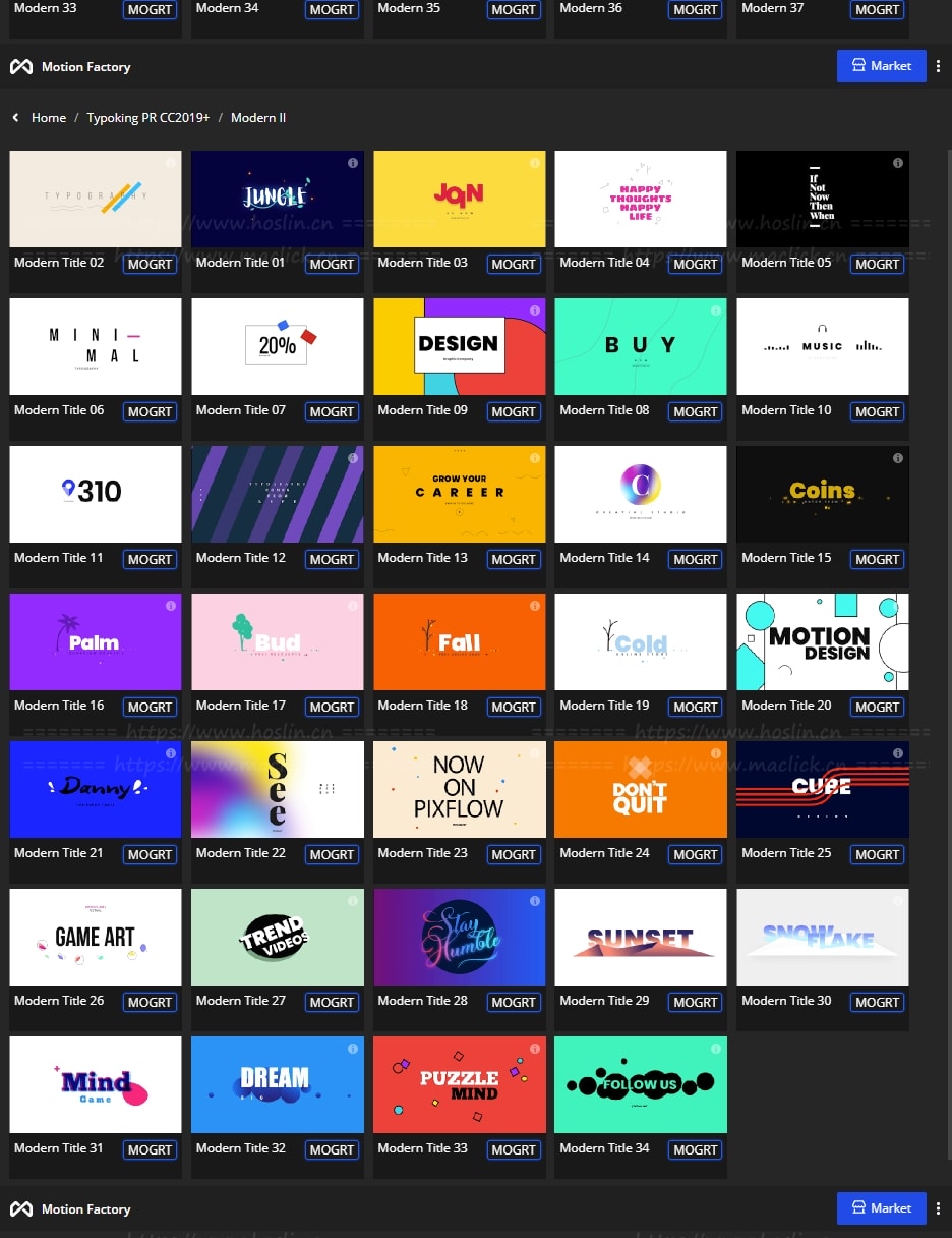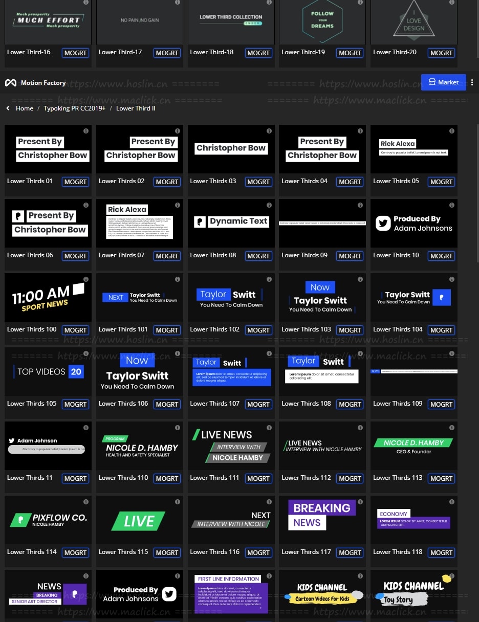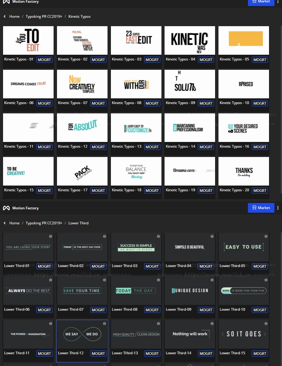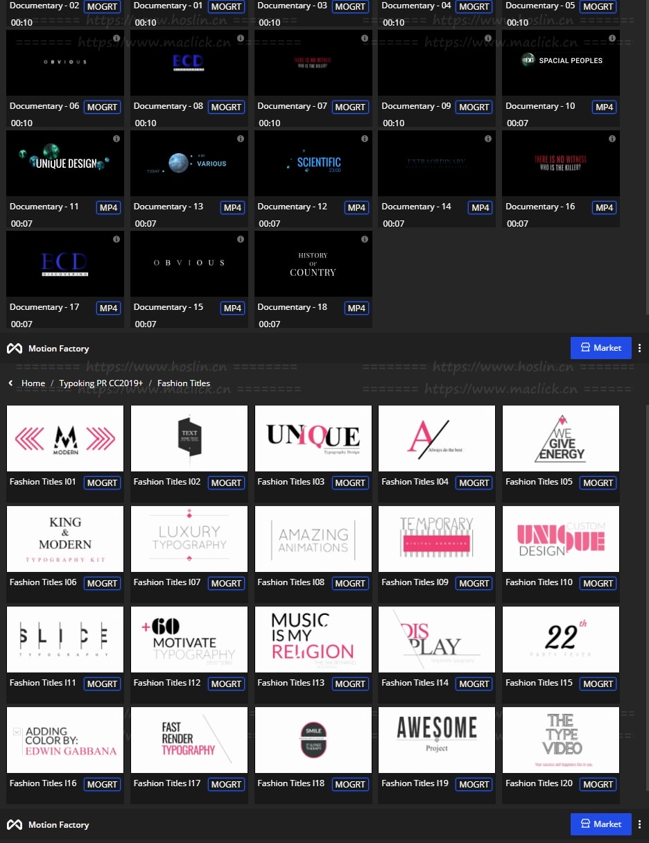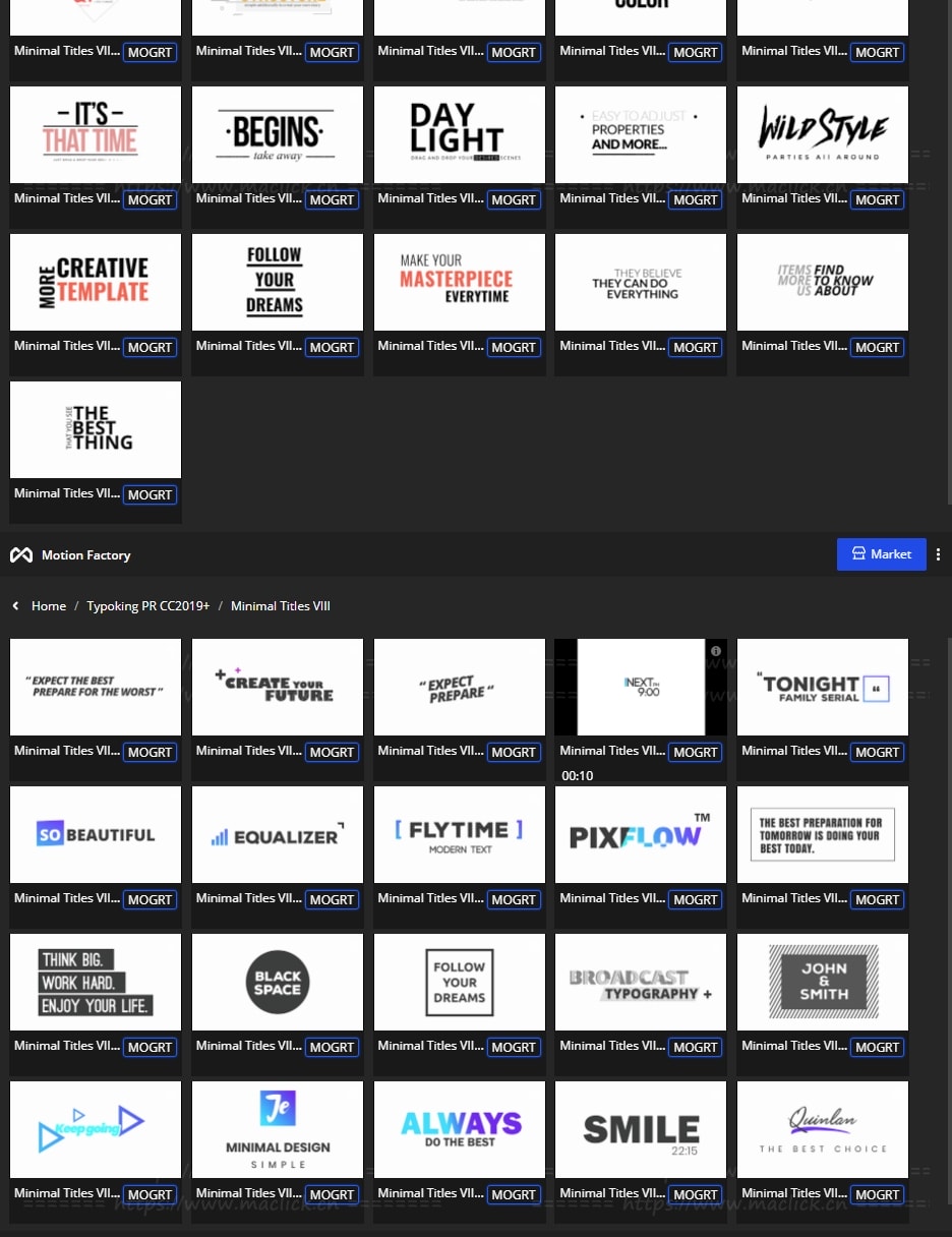 拥有27类超过1122个现代新颖时尚精美个性文字标题排版动画。使用Motion Factory脚本扩展预览,需要什么点击即可,能够修改文字内容和颜色等属性,非常方便。支持4K分辨率,无需插件。包含视频教程。