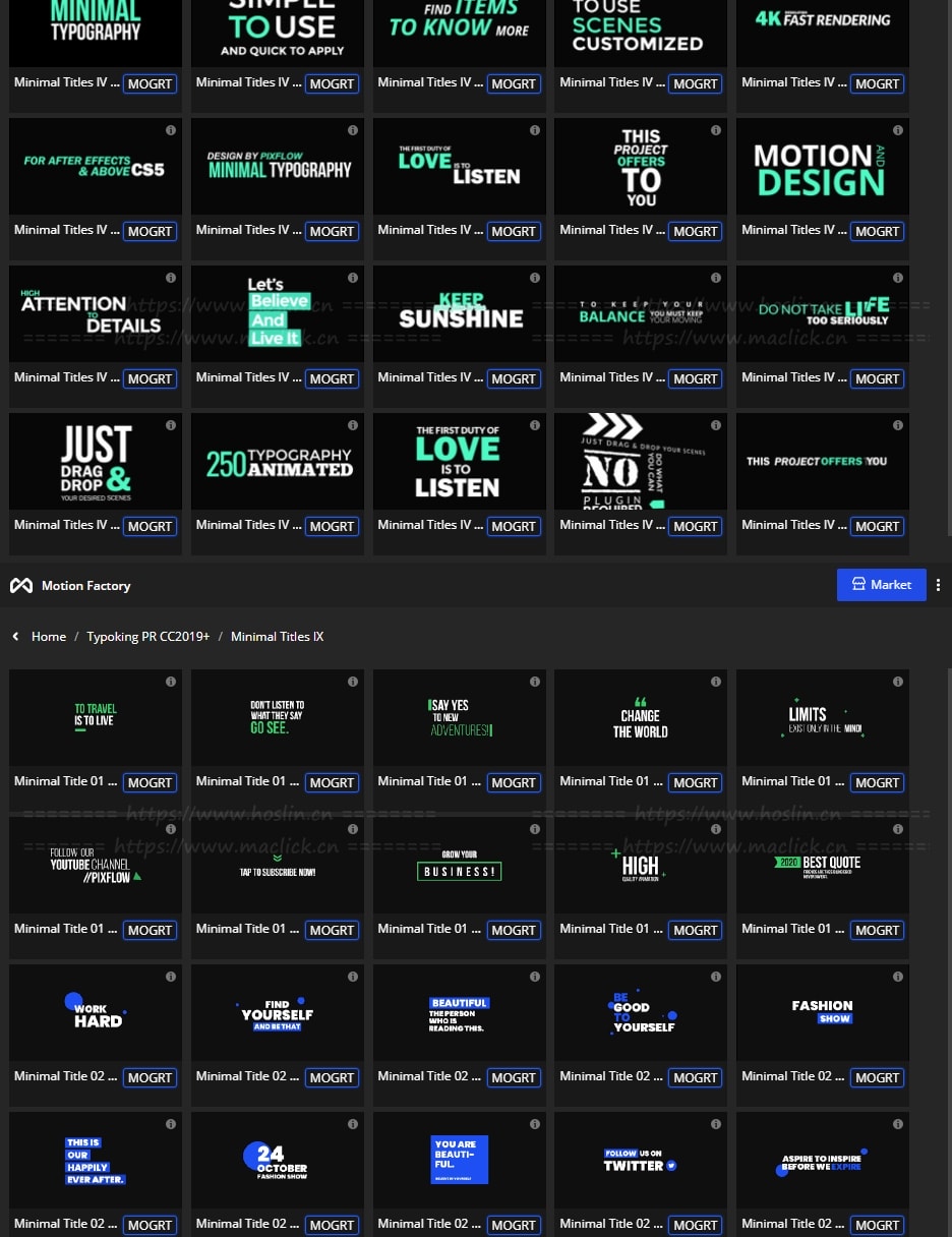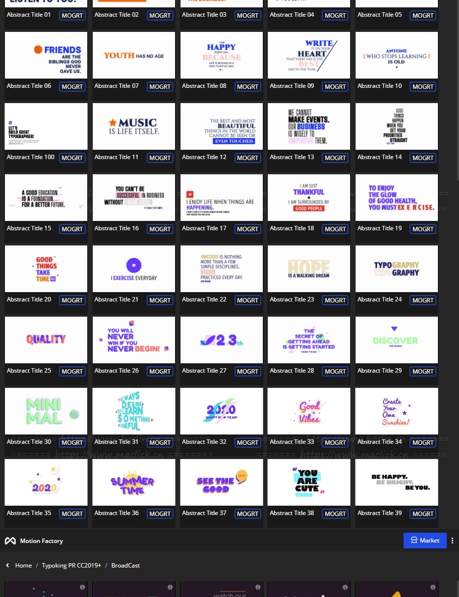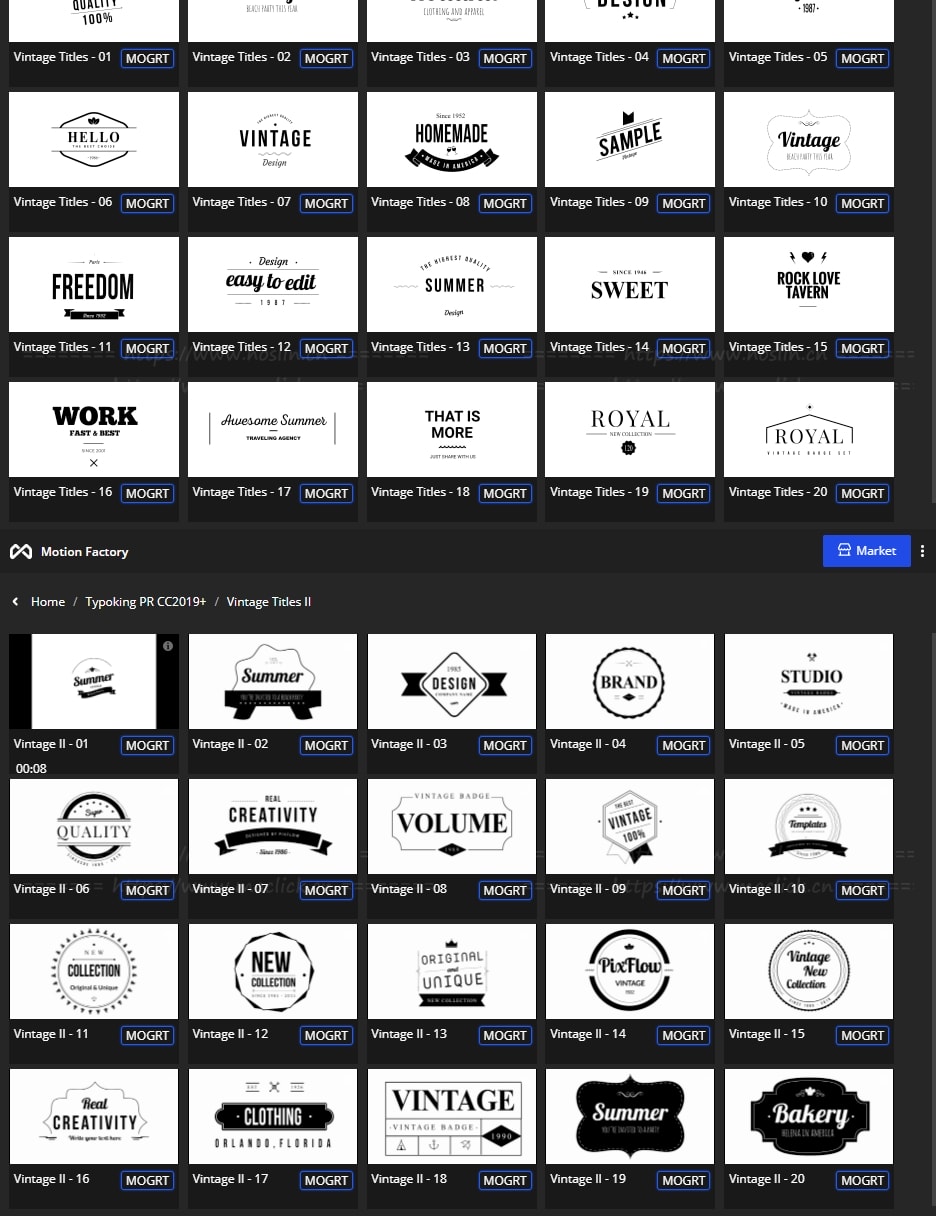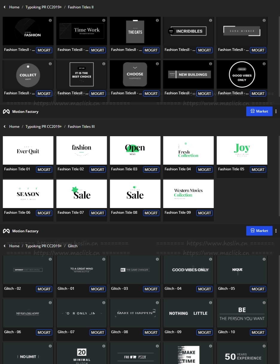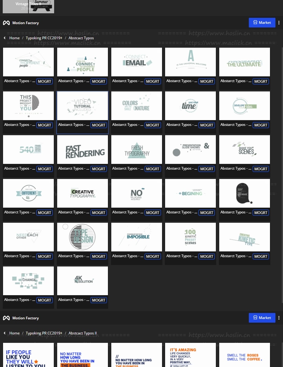 拥有27类超过1122个现代新颖时尚精美个性文字标题排版动画。使用Motion Factory脚本扩展预览,需要什么点击即可,能够修改文字内容和颜色等属性,非常方便。支持4K分辨率,无需插件。包含视频教程。