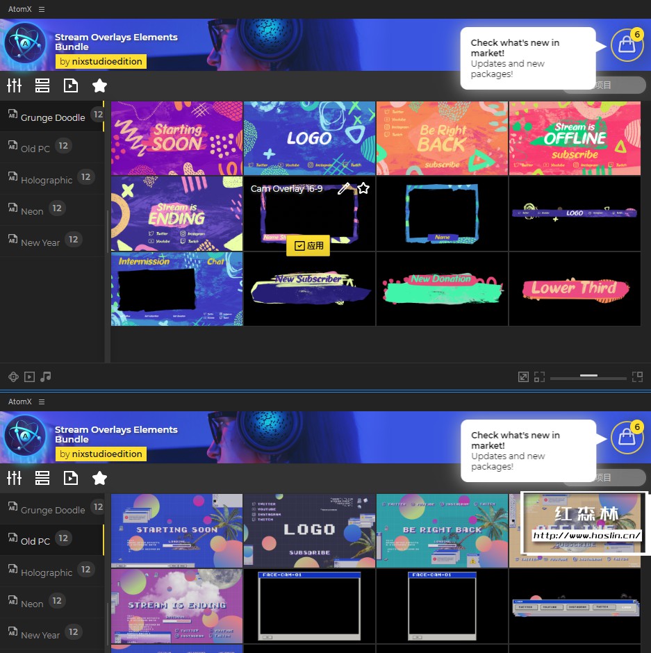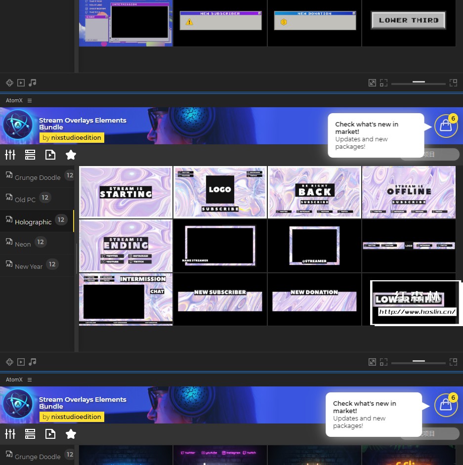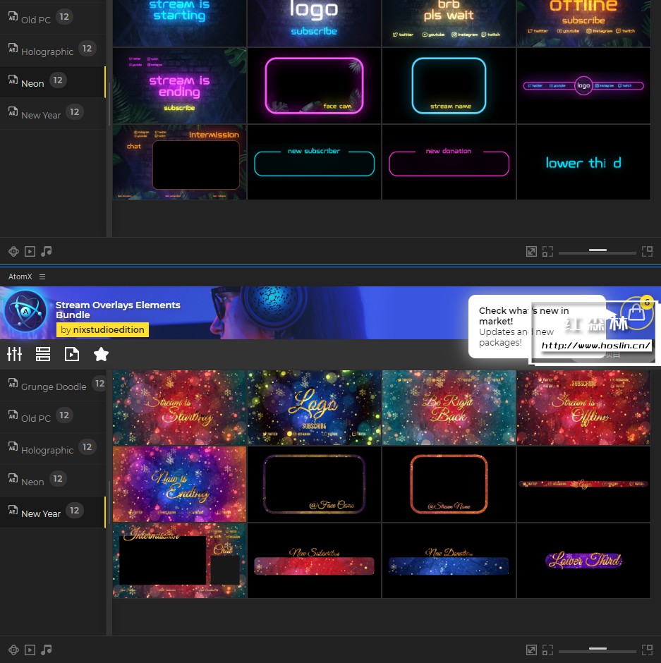After Effects 的 Stream Overlays Elements Bundle 是一套很棒的预设工具,可以将您的实时流设计提升到一个新的水平。有60多个场景和元素可供使用!使用AtomX脚本实时预览所有视觉动画、自定义文本和颜色而不会弄乱图层。