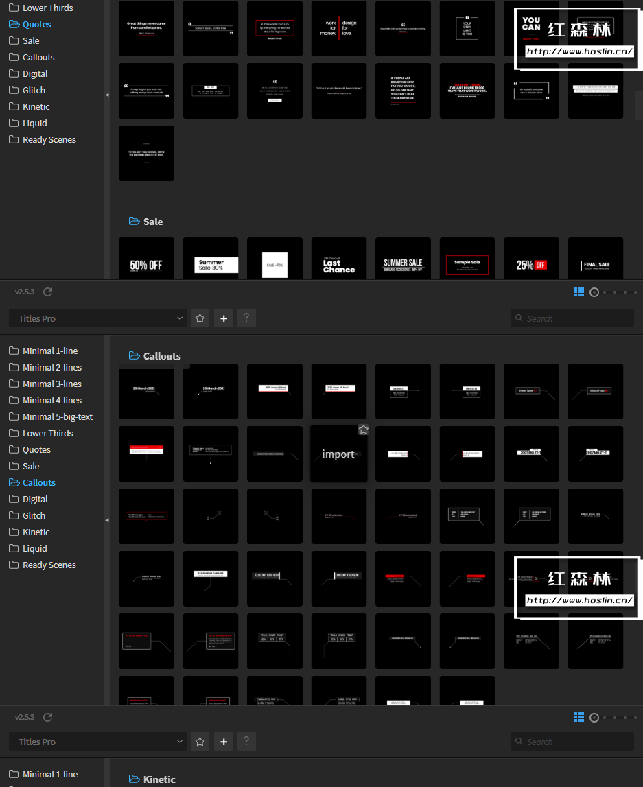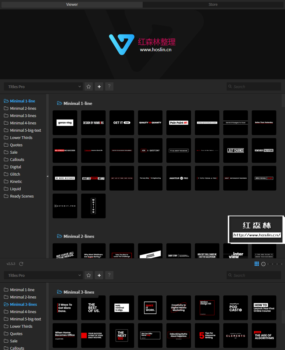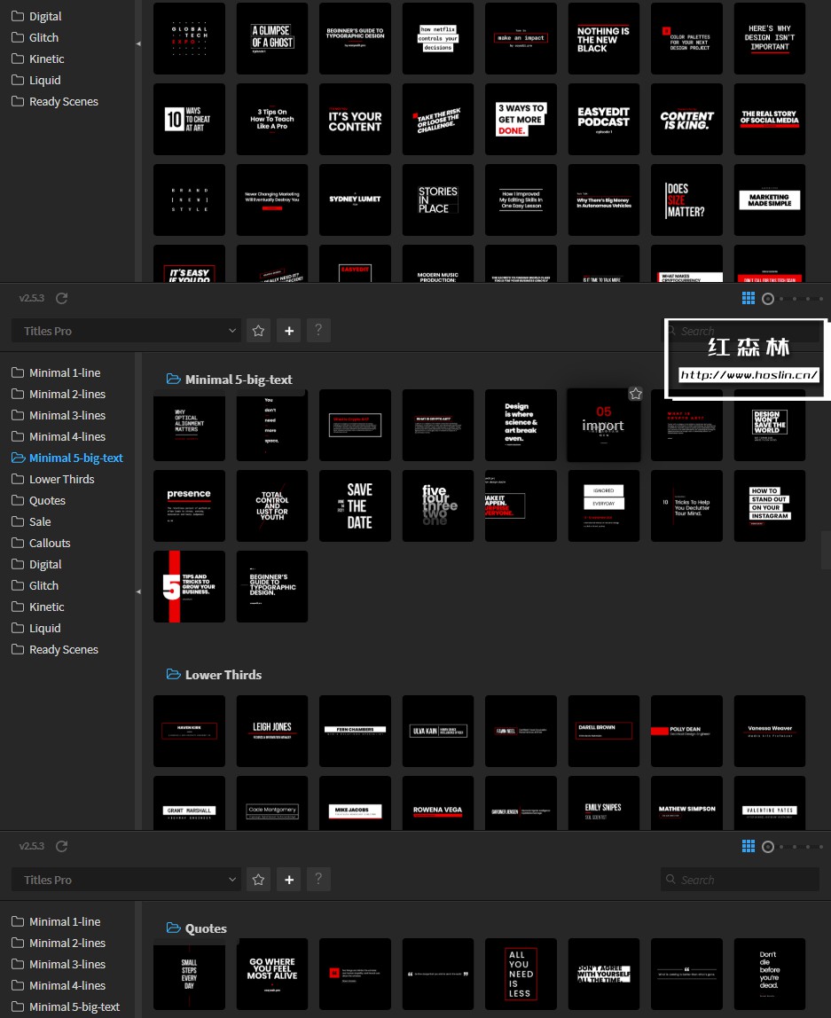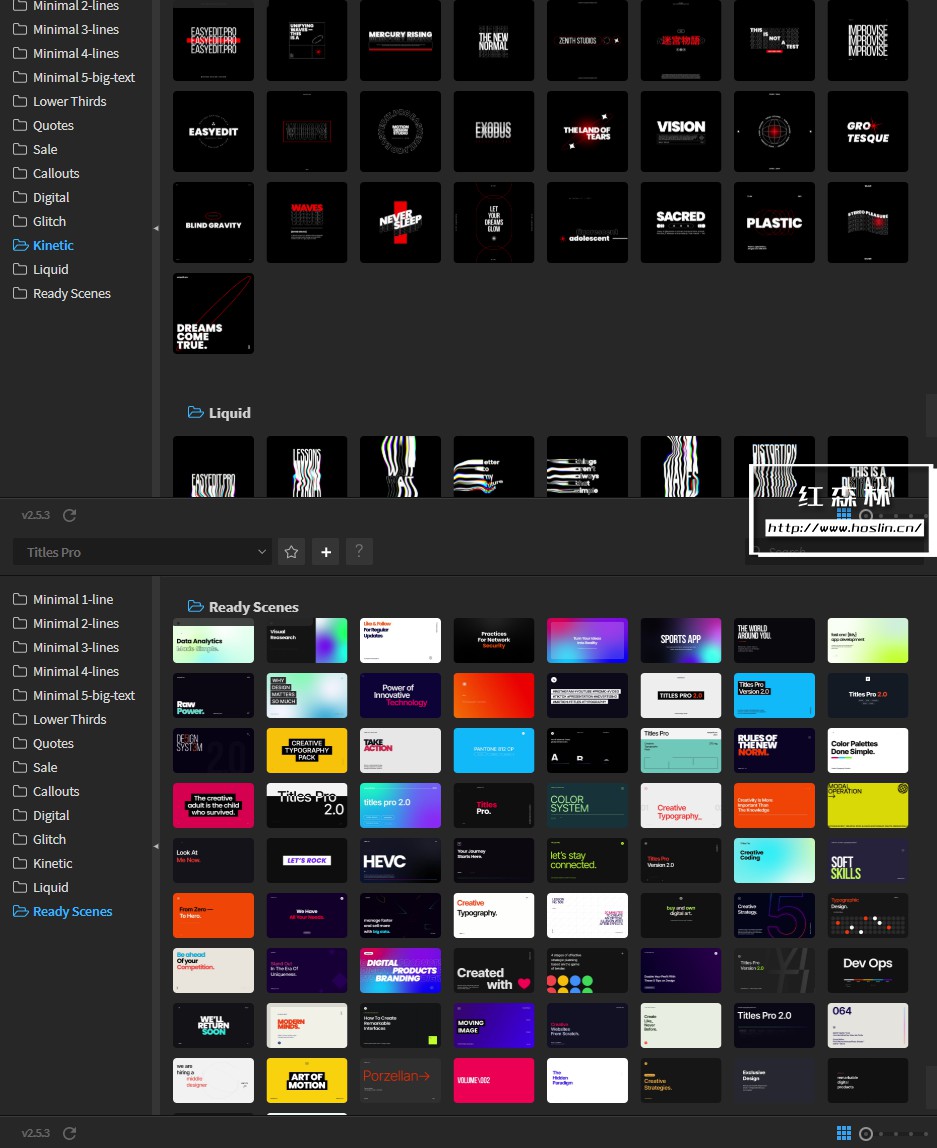 在这里您可以找到1400多种排版组合、新类别,例如液体、数字、故障、场景或动力学、预制的AI素材文件。使用EasyEdit脚本调用预设,可视化操作使用。只需一键添加您自己的内容,更改文本和颜色,使用智能自动调整大小来创建您需要的任何构图。