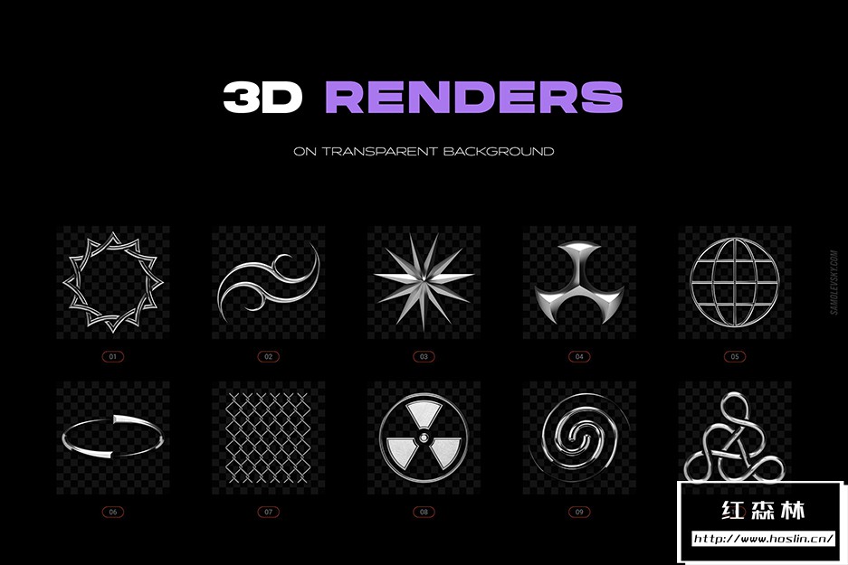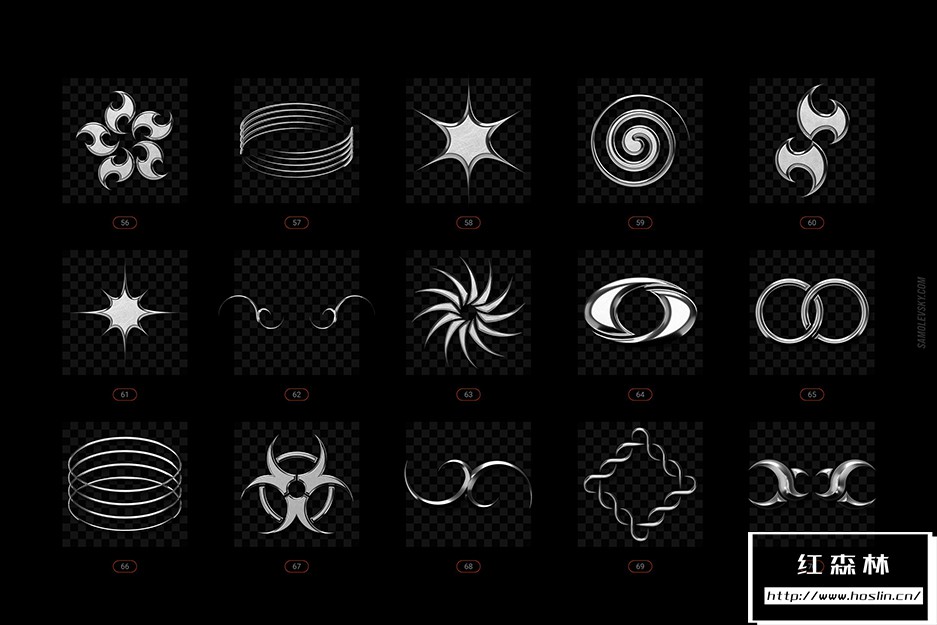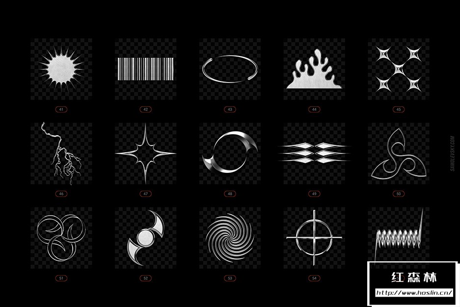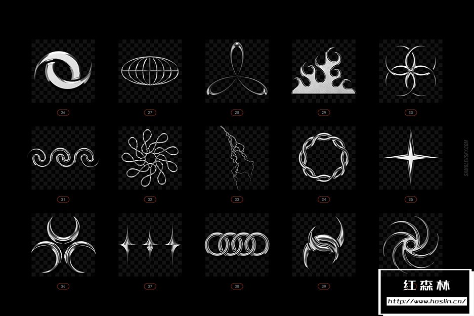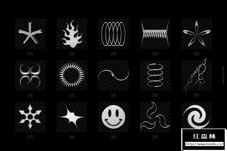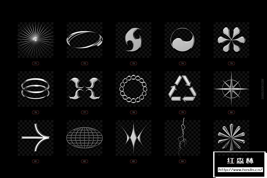 • PNG 文件– 100 个高分辨率 5000×5000 像素 3D 渲染,在透明背景上具有光滑、细致的镀铬外观。